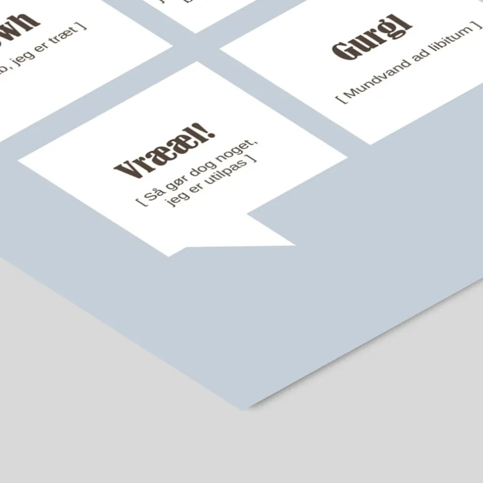 - Farve: Lys blå baggrund med sort/hvid tekst