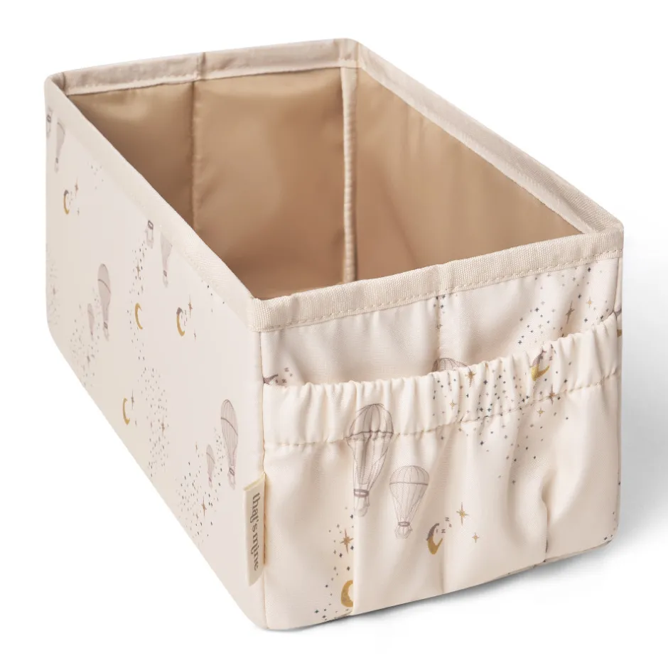 Pusleopbevaringskassen gør det nemt at organisere de ting man har brug for under pusletid. Kassen er perfekt til opbevaring af bleer, cremer, stofbleer og andre pusle nødvendigheder. Opbevaringskassen består af et stort rum samt en lomme i enden. Når du ikke bruger kassen og vil spare plads, kan du åbne bunden og tage den hårde bund ud og folde den sammen. Vask: Tåler ikke maskine vask, tør blot af med en fugtig klud. Længde: 32 cm / Bredde: 15 cm / Højde: 13 cm