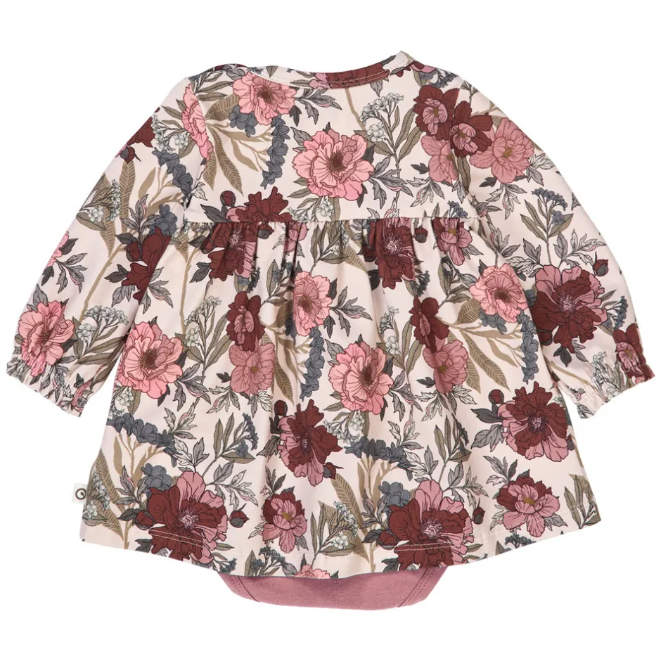 Denne super søde bodykjole er dekoreret med et smukt, gennemgående print af store blomster og har fine flæser ved ærmeafslutningerne, som giver et feminint og festligt udtryk. En bodykjole er både praktisk og elegant – perfekt når de mindste skal være pænt klædt på uden at gå på kompromis med komforten.