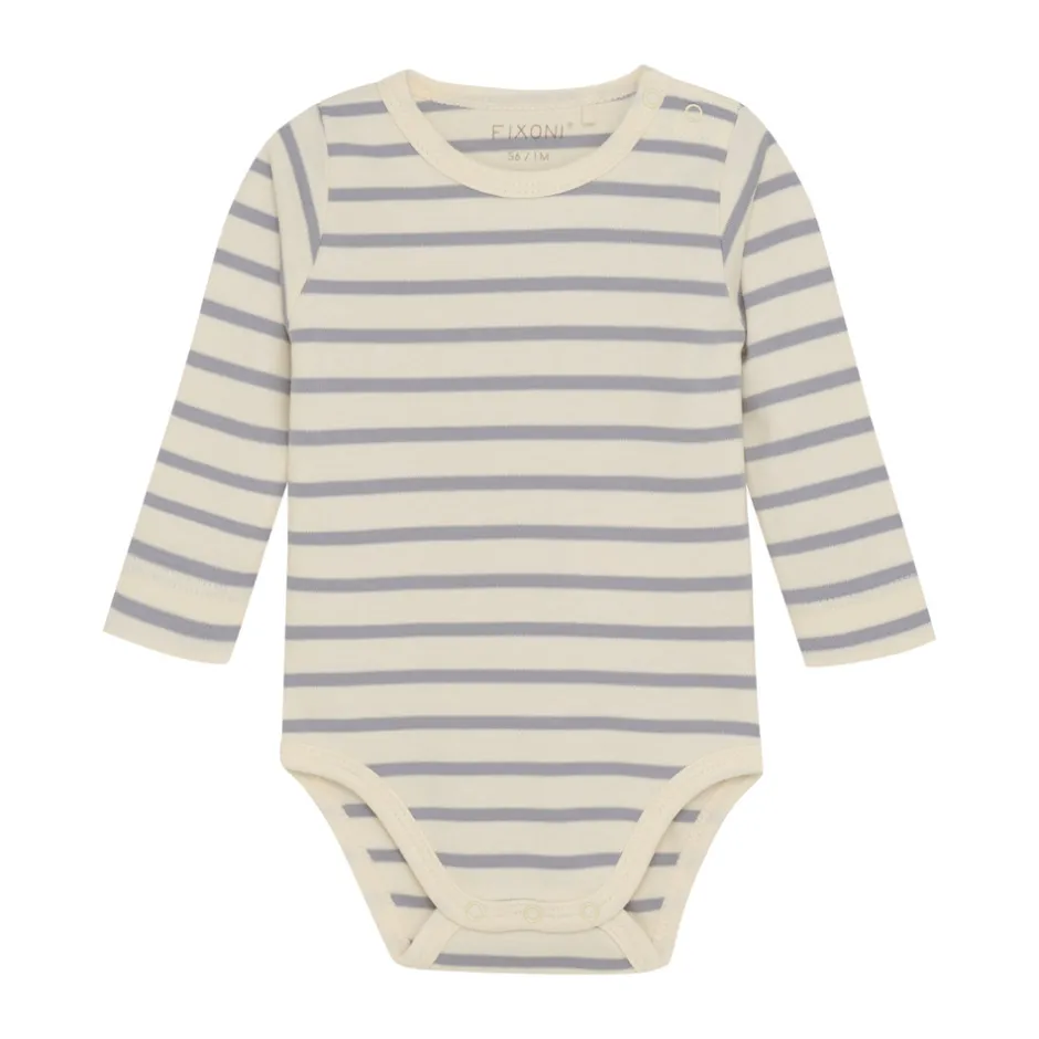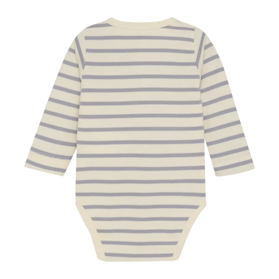 Langærmet body med stilfuldt stribet mønster. Komfortabel og perfekt til daglig brug. Trykknap ved skulder, for letter at få af og på. Ligeledes er der trykknapper forneden til nemt bleskift.