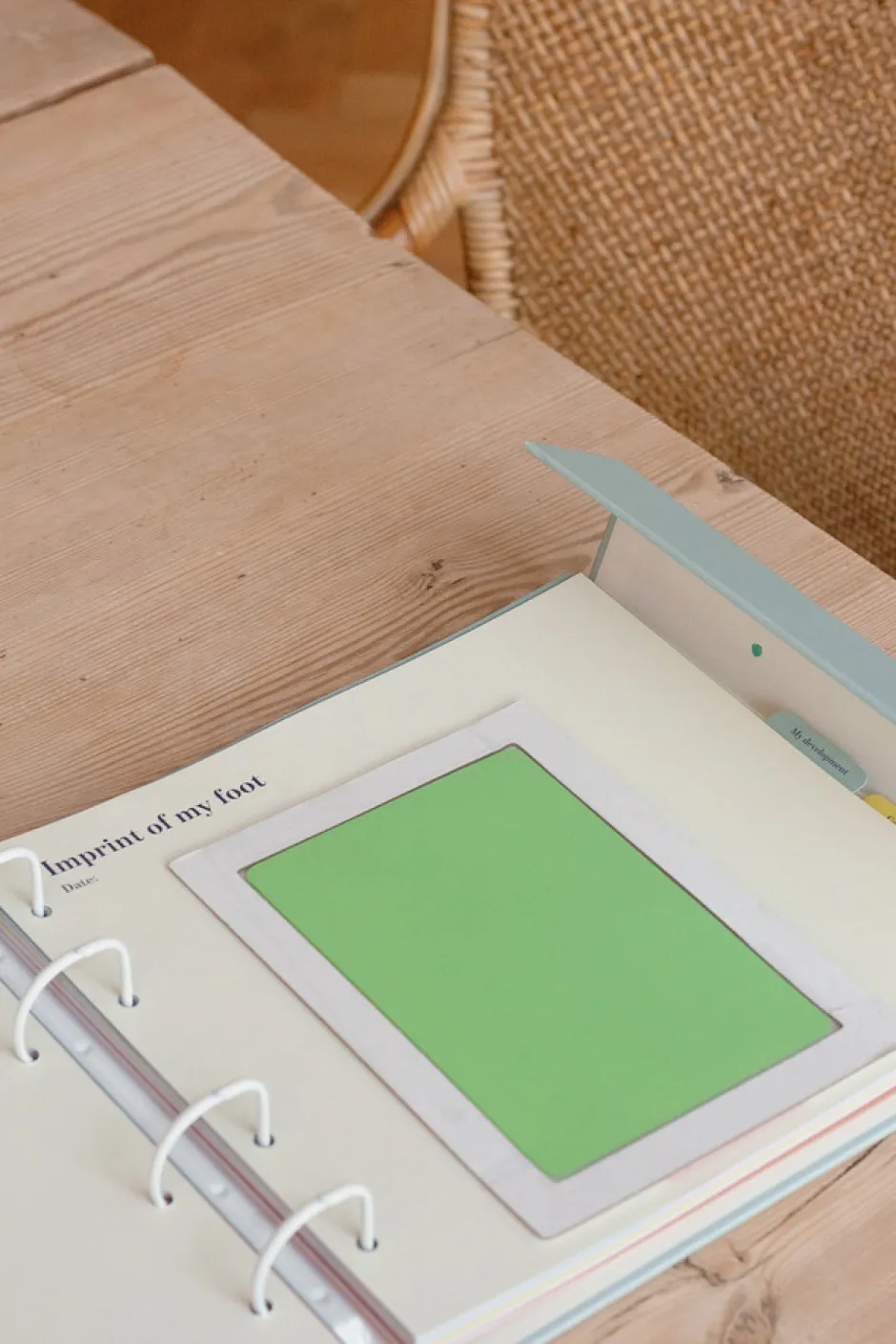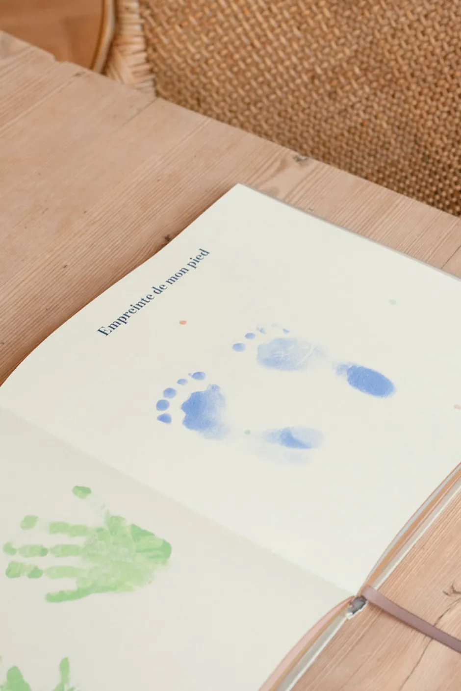 Hånd- og fodaftryk til baby og små børn i fine farver der passer til siderne i barnets bog fra Specialday. Non-toxic clean-touch blækpude