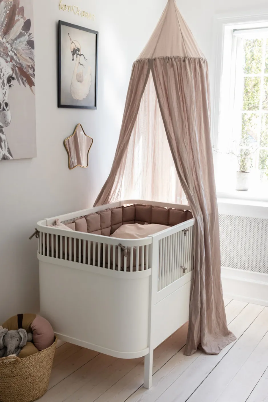 Smuk og enkel sengehimmel der tilføjer et elegant og stilfuldt touch til børneværelset. Sengehimlen er designet i Danmark og kan bruges over babysengen for at skabe en tryg og beroligende atmosfære omkring sovemiljøet. Vågner dit barn tidligt, f.eks. pga. morgensol, så kan en sengehimmel også bidrage til at gøre sengeomgivelserne lidt mørkere. Det smukke stof er monteret på en metalbøjle med et kryds, hvorfra der eksempelvis kan hænges en uro eller drømmefanger.