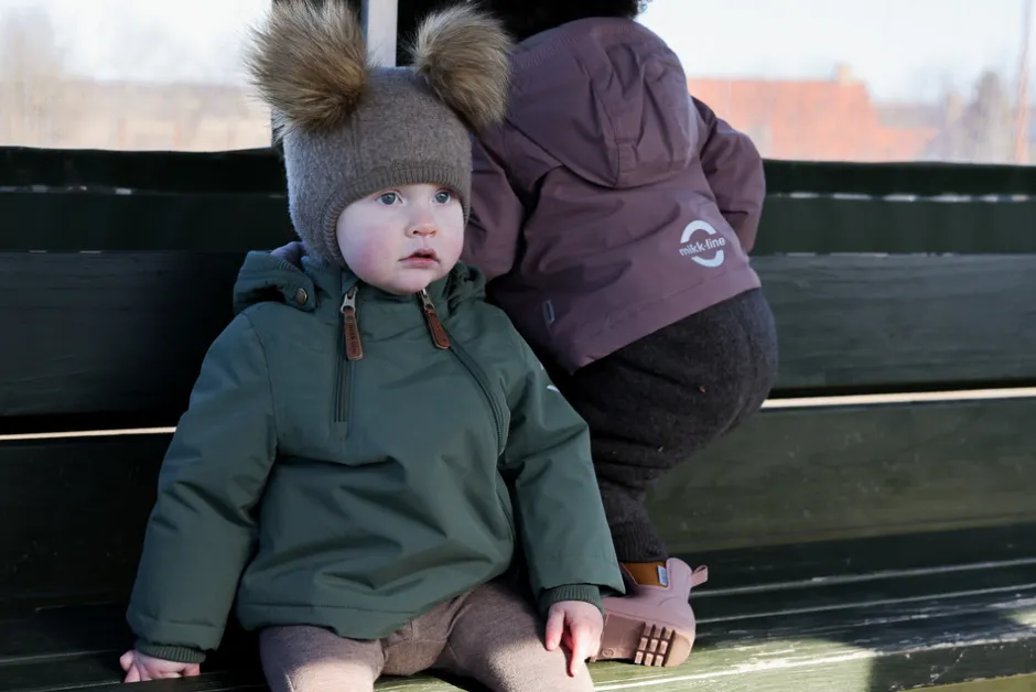 Ensfarvet Mikk-line baby vinterjakke til børn, der elsker leg og eventyr i naturen og under åben himmel. Det er en holdbar nylon vinterjakke af høj kvalitet og enkelt design, der holder barnet varmt og komfortabelt i det kolde efterårs- og vintervejr med vind, regn og sne.