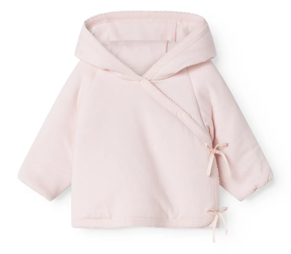 Denne varme og bløde jakke er perfekt til de mindste i de kølige måneder. Jakken har en praktisk slå-om-lukning med trykknapper og bindebånd, som gør den nem at tage af og på. Fra størrelse 0M til 9M har jakken smarte ombuk på ærmerne, så hænderne kan holdes varme uden brug af vanter.
