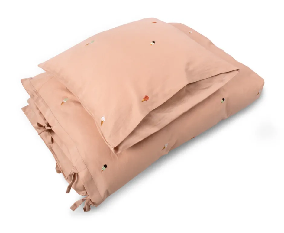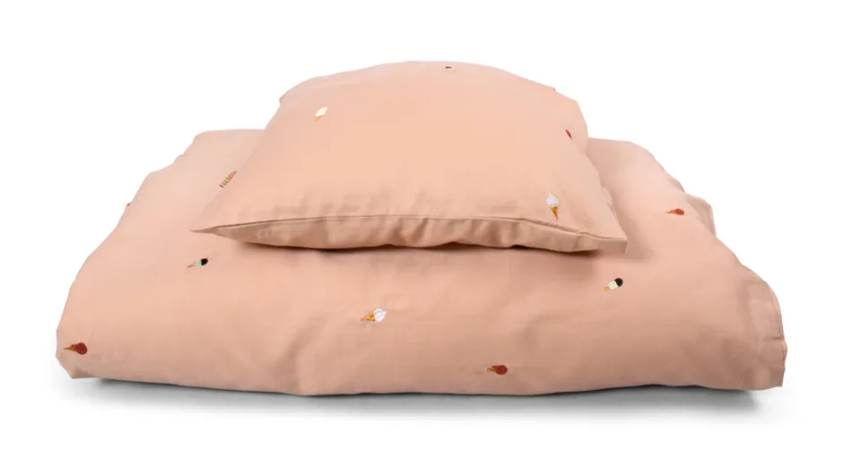 Os forældre bruger meget tid på at hjælpe vores kære små med at falde i søvn, og findes der egentlig en bedre måde at slutte dagen på end at blive puttet ned i små glimt af glæde med et kys? Lad din baby blive omfavnet af det blødeste sengesæt i 100% GOTS-certificeret økologisk bomuld med broderede is.