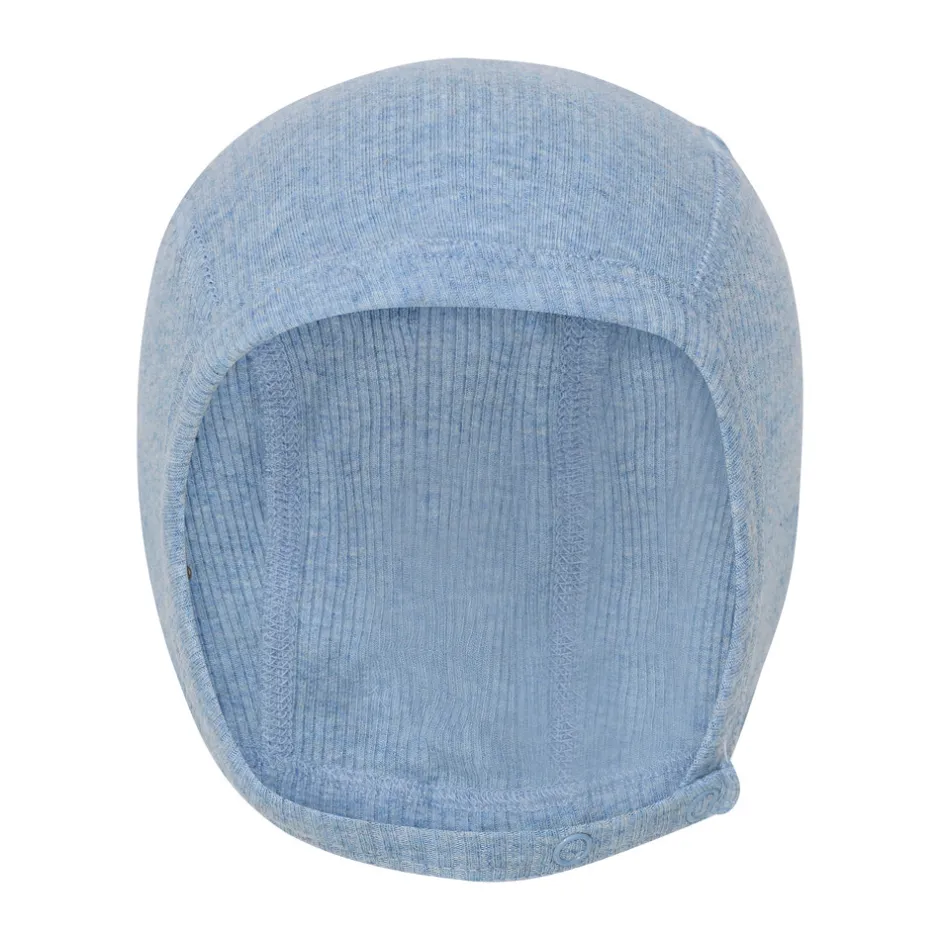 Babyhue fra FIXONI i smuk mélange-kvalitet. Huen lukkes under hagen med en justerbar trykknap, som sikrer en god og behagelig pasform.