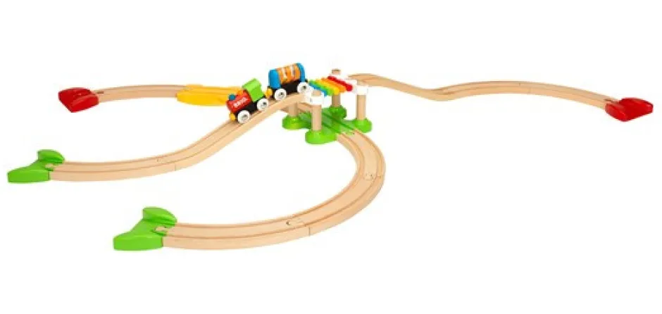 Nu er det tid for de yngste togførere at tage på nye eventyr! Udbyg toglegen med denne større startpakke. Tag det sjove tog med ud på en tur over eller under den spændende, regnbuefarvede hængebro og udforsk de forskellige togbaner, du kan bygge. Perfekt til det nysgerrige lille barn. B. 653 x D: 994 mm. Fra 18 måneder.
