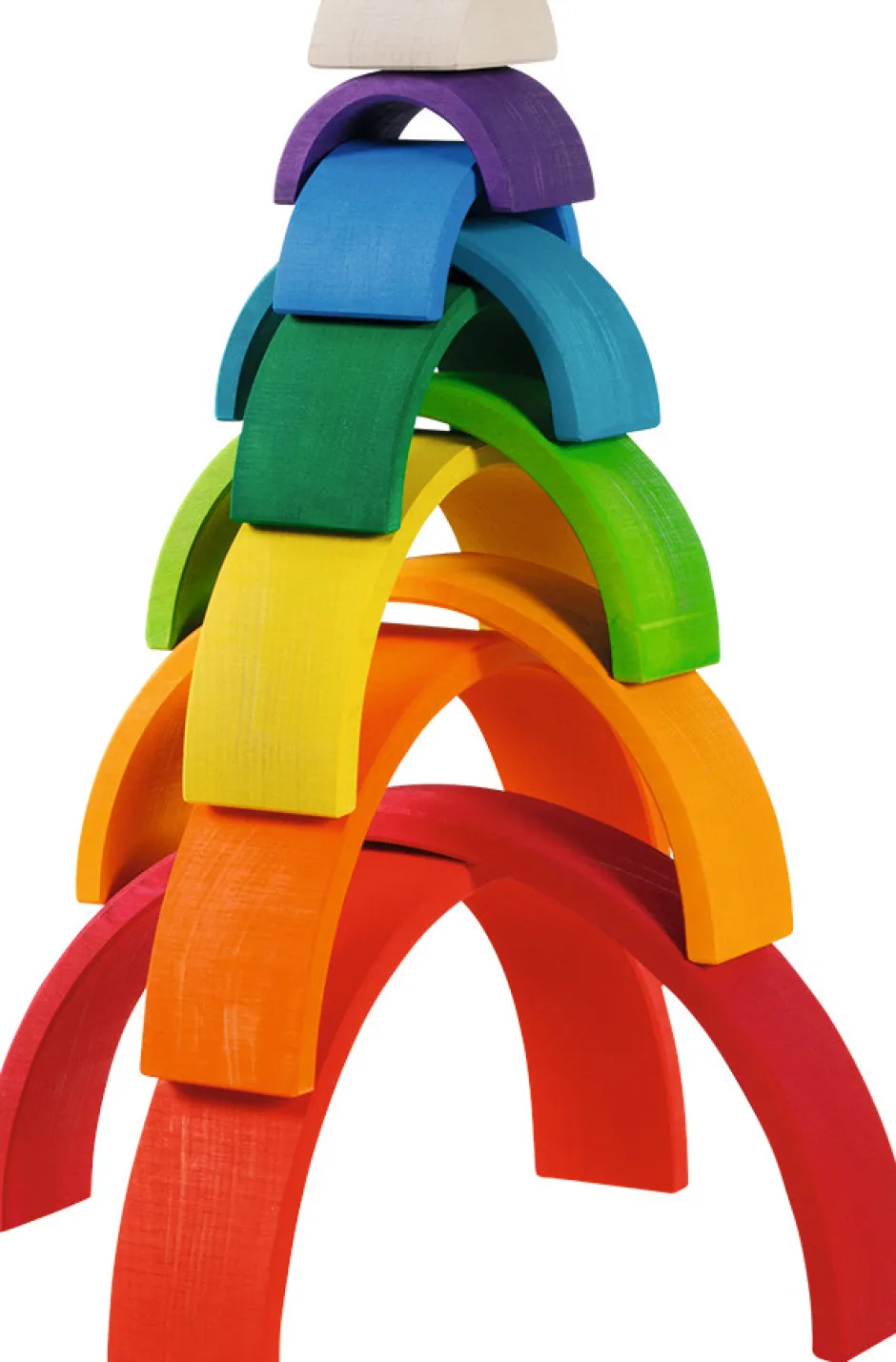 Denne farverige regnbue af ahorntræ giver børn mulighed for at stable og sortere, samtidig med at de legende lærer om størrelser, sekvenser og farver. Der er ingen grænser for at skabe magiske verdener gennem fri leg – en sand klassiker inden for trælegetøj.