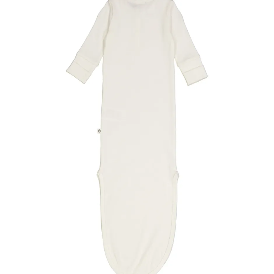 Skøn og blød ribbet soveposedragt med knude lukning i bunden Knuden ved den lilles fødder gør det nemt med hyppige bleskift. Specielt smart om natten hvor man ikke vil vække baby mere end højest nødvendigt. Der er ydermere vendbare hænder, så man kan holde babys hænder inde i dragten. Brug den til at give ekstra tryghed, som sovepose en varm sommerdag, eller hvor den passer ind for jer. Den tilpasser sig barnet, og giver en omsvøbende effekt. Ribstrikken giver en dejlig elastisk fornemmelse, der smyger sig om baby og holder formen. Fremstillet i bomulds-rib med elastan for bedst mulig pasform og komfort. (GOTS Organic Certified by Ecocert Greenlife Lic. No. 152033). Produktet er GOTS organic- certificeret, hvilket betyder at bomulden er certificeret økologisk, og at der i alle andre processer som farvning, strikning og syning er taget de strengeste hensyn til miljøet. GOTS er internationalt anerkendt som den førende standard for forarbejdning af tekstiler af økologisk bomuld. Derudover tages der også hensyn til arbejdsforholdene, hos dem der producerer tøjet. Økologisk bomuld 95%, Elastan 5%