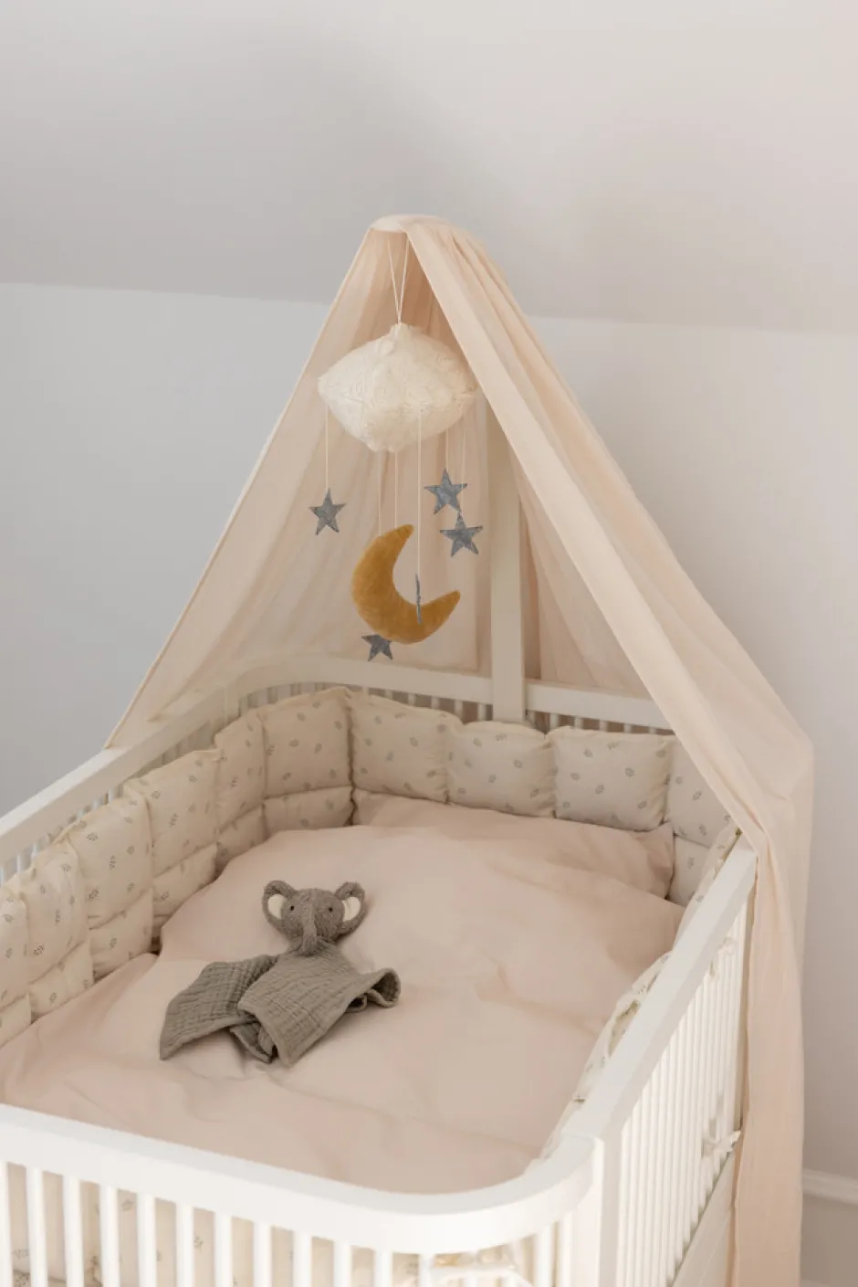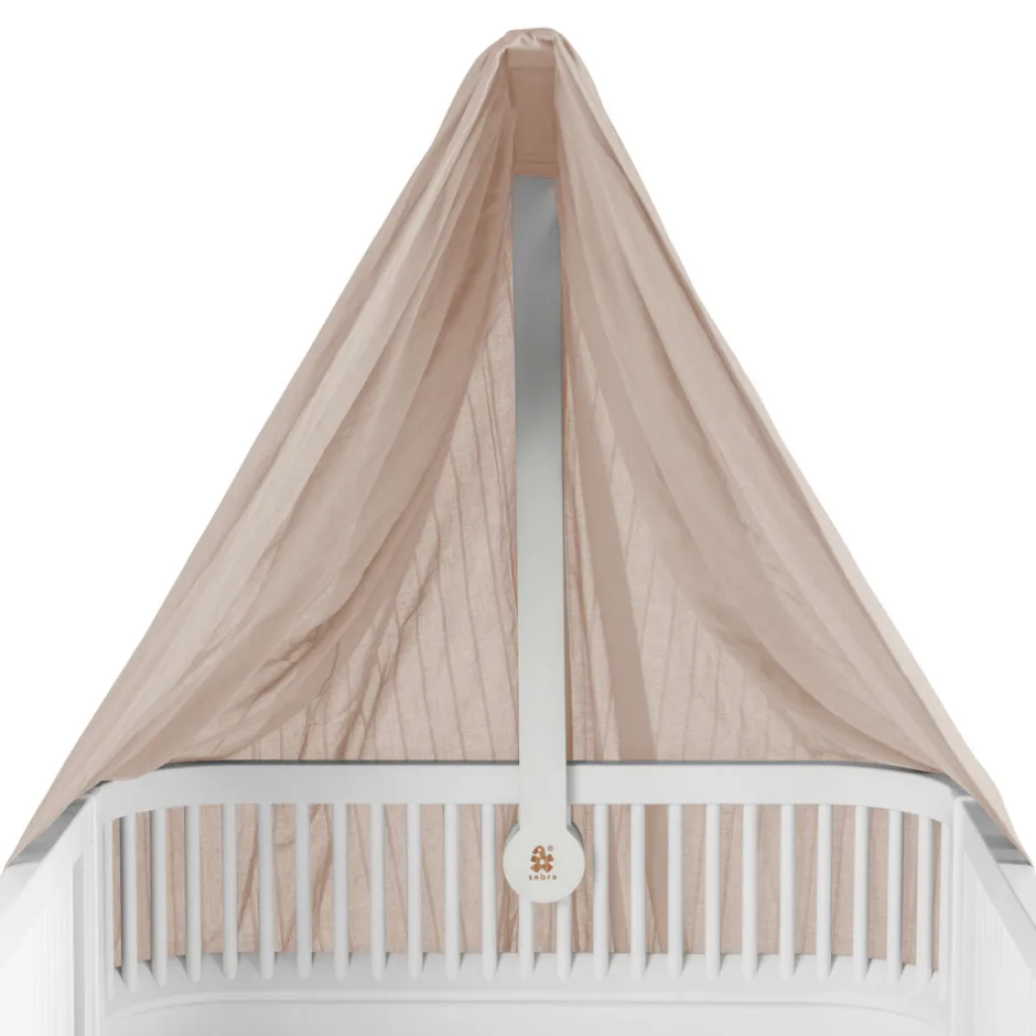 Sengehimlen er designet, så den kan trækkes på en Sebra uroholder og derved komme tættere på sengen, på samme måde som du kender det fra en vugge med himmel. Sengehimlen er fremstillet i en elegant dobby-vævning af 100% certificeret, økologisk bomuld, der kan vaskes ved 40 ℃. Den lette kvalitet sikrer, at luften kan cirkulere frit, hvilket gør sengehimlen både praktisk og smuk. Sengehimlen er ideel til at skabe et afskærmet og roligt sovemiljø for dit barn. Den er designet i Danmark og tilgængelig i flere smukke farver, der matcher Sebras øvrige tekstiler som sengetøj, lagner og sengerande.