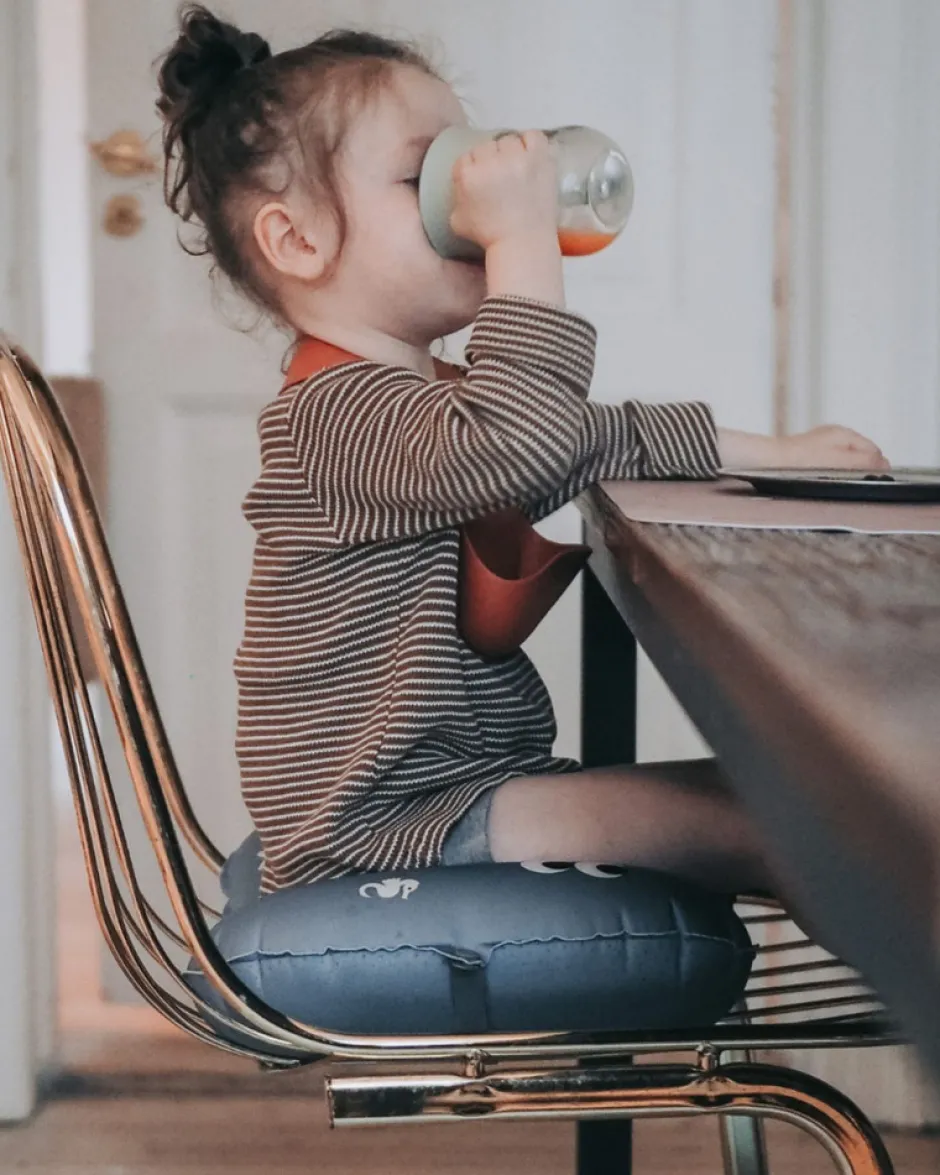 Oppustelig siddepude til barnet, der er for stort til højstolen og for lille til en spisestol.