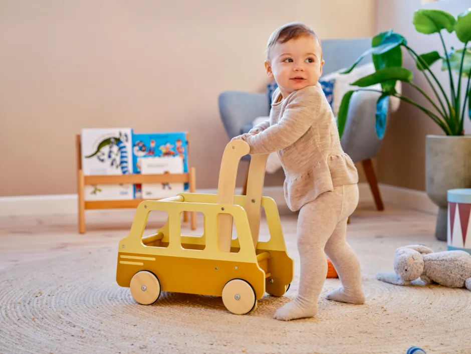 Skolebus Skubbevogn fra Moover Toys er en danskdesignet skubbevogn, der kombinerer funktionalitet med et sjovt og kønsneutralt skolebus-design. Den lette og kompakte skubbevogn er perfekt til at støtte dit barn, når de tager deres første skridt, og den opmuntrer samtidig til timevis af fantasifuld leg.