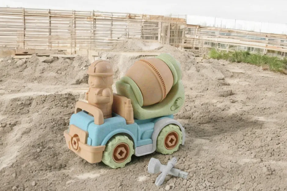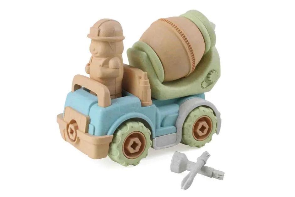 Cementblander legetøjsbil lavet af biomateriale fra hvedestrå. 100% nedbrydeligt.