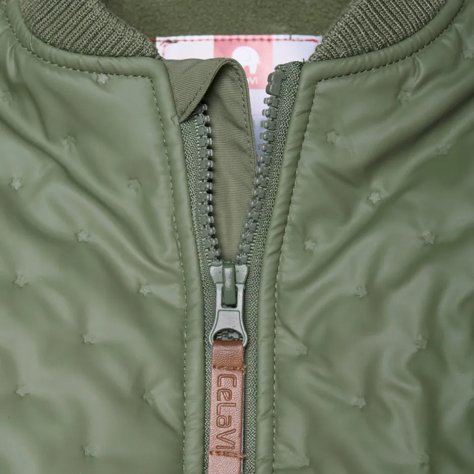 Termotøj med PU-belægning, som gør termotøjet vandtæt. Derudover er sættet foret indvendigt. Ekstra forstærket på knæ og bagpå på bukserne. Bukserne har desuden elastik i talje og ved ankler. Jakken har ribkant ved hals og håndled samt lynlåslukning. CeLaVi-logo foran.