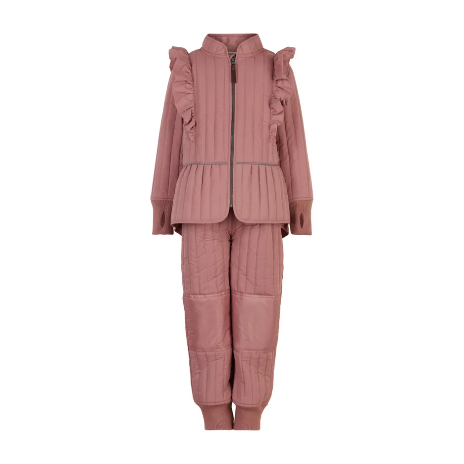 Fantastisk og elegant termosæt med flæser fra EN FANT. Dette termosæt er fremstillet i et vandtæt materiale, hvilket gør sættet super praktisk. Lynlås fortil, justerbar talje samt elastik ved ærmer og ankler.