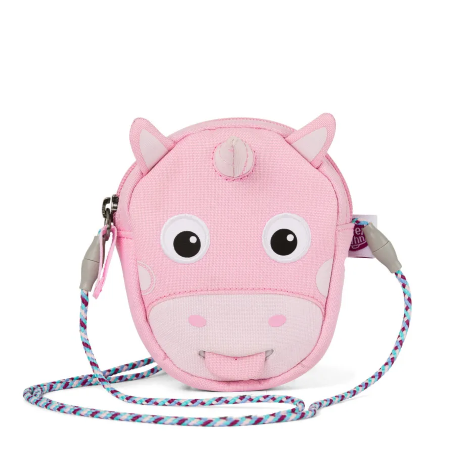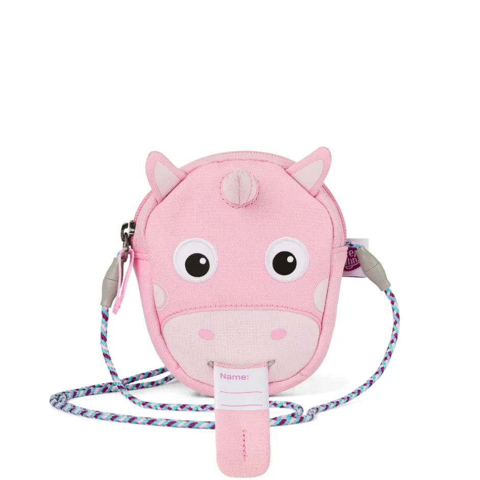 Affenzahn-pungen med navneskilt på den udtrækbare tunge med. Har sikkerhedskliklås på snoren og er nem at bære for de små eventyrer.