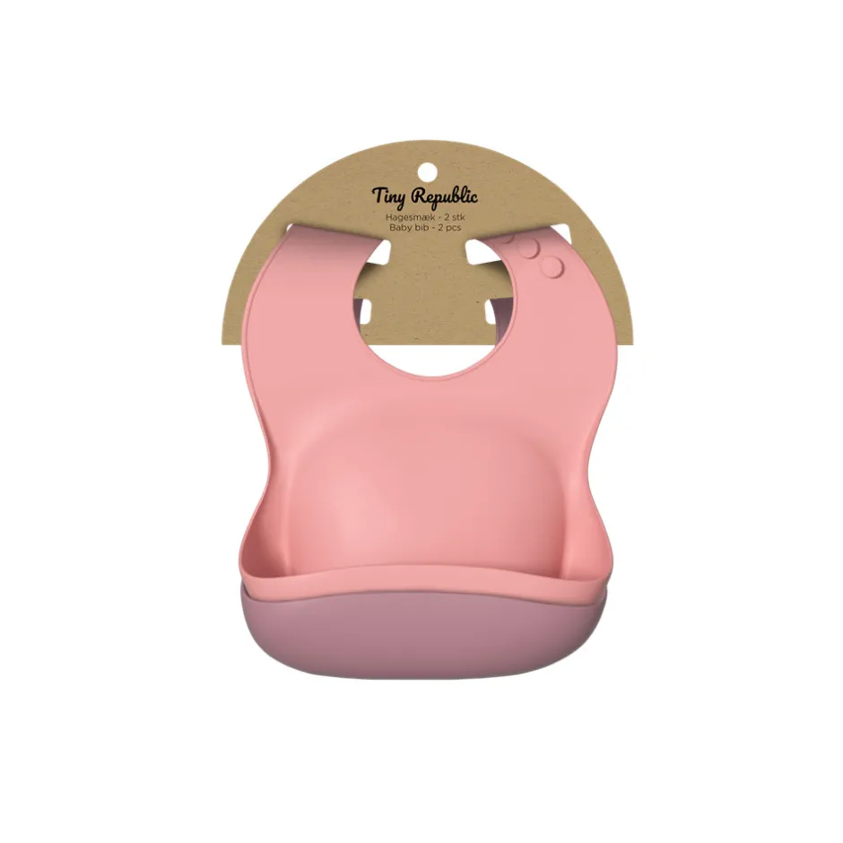 Sæt af 2 silikonehagesmække, som har praktisk opsamler og samtidigt er let at rengøre. Fremstillet i fødevaregodkendt silikone og tåler opvaskemaskine, ovn og fryser.
