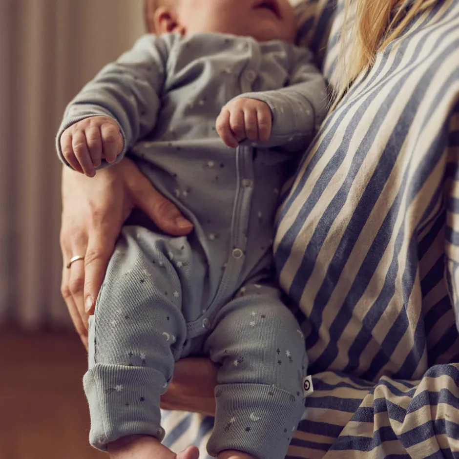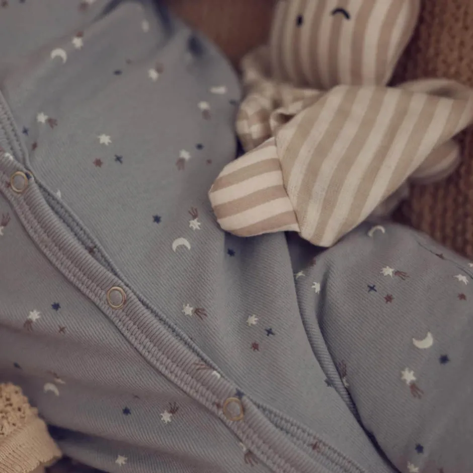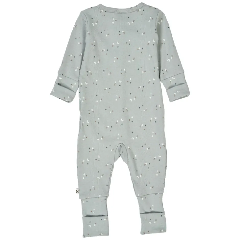 Skøn heldragt i blød blød rib kvalitet. Smukt gennemgående print af stjerner. Heldragten lukkes fortil med tryklåse og har vendbare fødder og hænder. Dragten er perfekt til de små for at sikre at de ligger lunt og trygt. De vendbare fødder og hænder kan foldes efter behov.