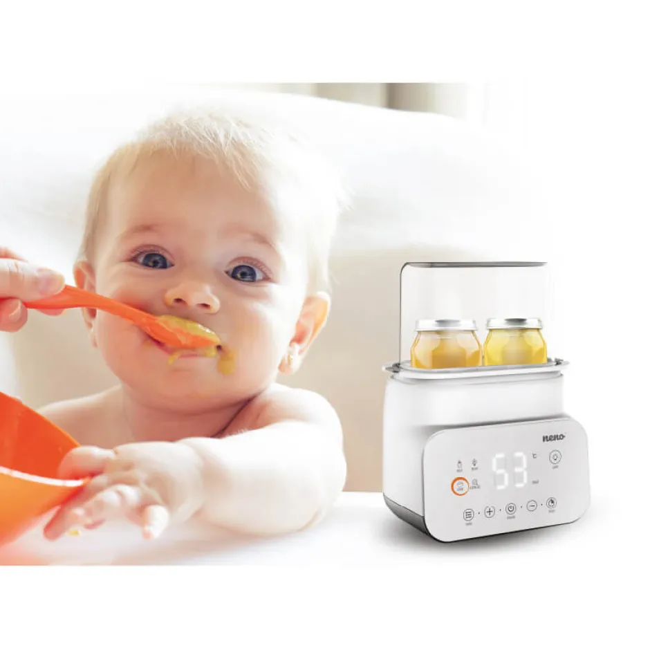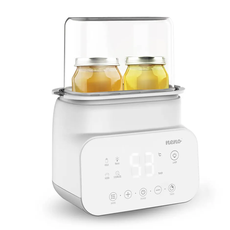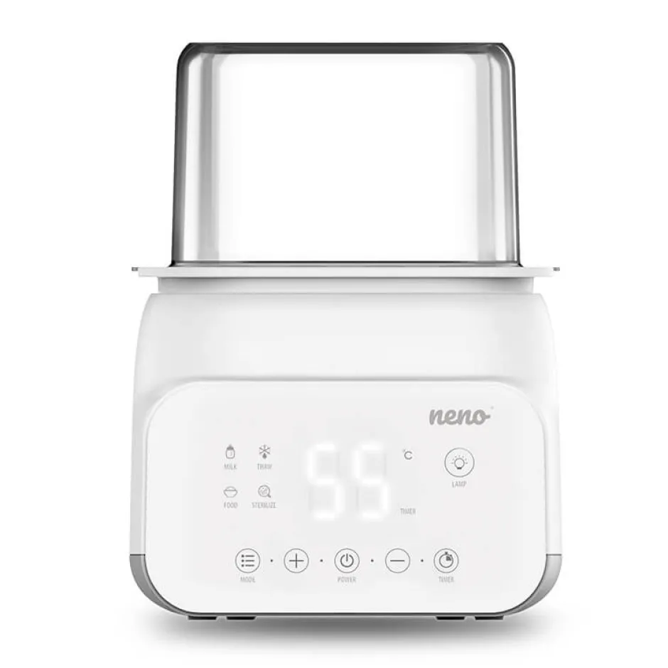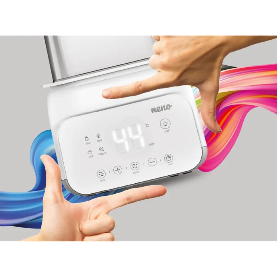 Neno Vita Sterilisator & Flaskevarmer har 4 Måder At Arbejde På – Den Steriliserer Sutteflasker, Optøer & Opvarmer Mælk & Mad! Neno Vita er udstyret med en steriliseringsfunktion, der giver dig mulighed for at holde flasker og sutter hygiejniske og sterile. Brug den medfølgende flaskesil til at fjerne genstande sikkert og bekvemt efter sterilisering for at undgå forbrændinger. Enheden har en mælkeopvarmningsfunktion, som giver dig mulighed for hurtigt og let at opvarme mælk til din baby. Alt du skal gøre er at vælge den korrekte temperatur i indstillingerne og begynde at opvarme mælken. Vita har også en optøningsfunktion, der giver dig mulighed for hurtigt at optø måltider til dit barn og opvarme dem til den temperatur, du vælger, så de er klar til at servere. Takket være den indbyggede optøningsfunktion kan du ikke kun optø færdiglavet mad og supper, men også hårde ingredienser som frugt, grøntsager og mere. Det eneste du skal gøre er at lægge de frosne fødevarer i beholderen og vælge afrimningsindstillinger på displayet. Neno Vita har en indbygget natbelysning, der giver dig mulighed for at bruge den når som helst. Lampen er installeret inde i sterilisatoren og lyser forsigtigt op på enhedens låg. Neno White Sterilisator er udstyret med et displaypanel, som giver dig mulighed for let at navigere i enheden og vælge de relevante indstillinger i henhold til dine præferencer.