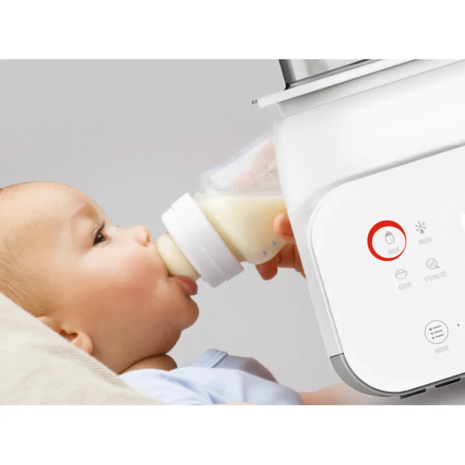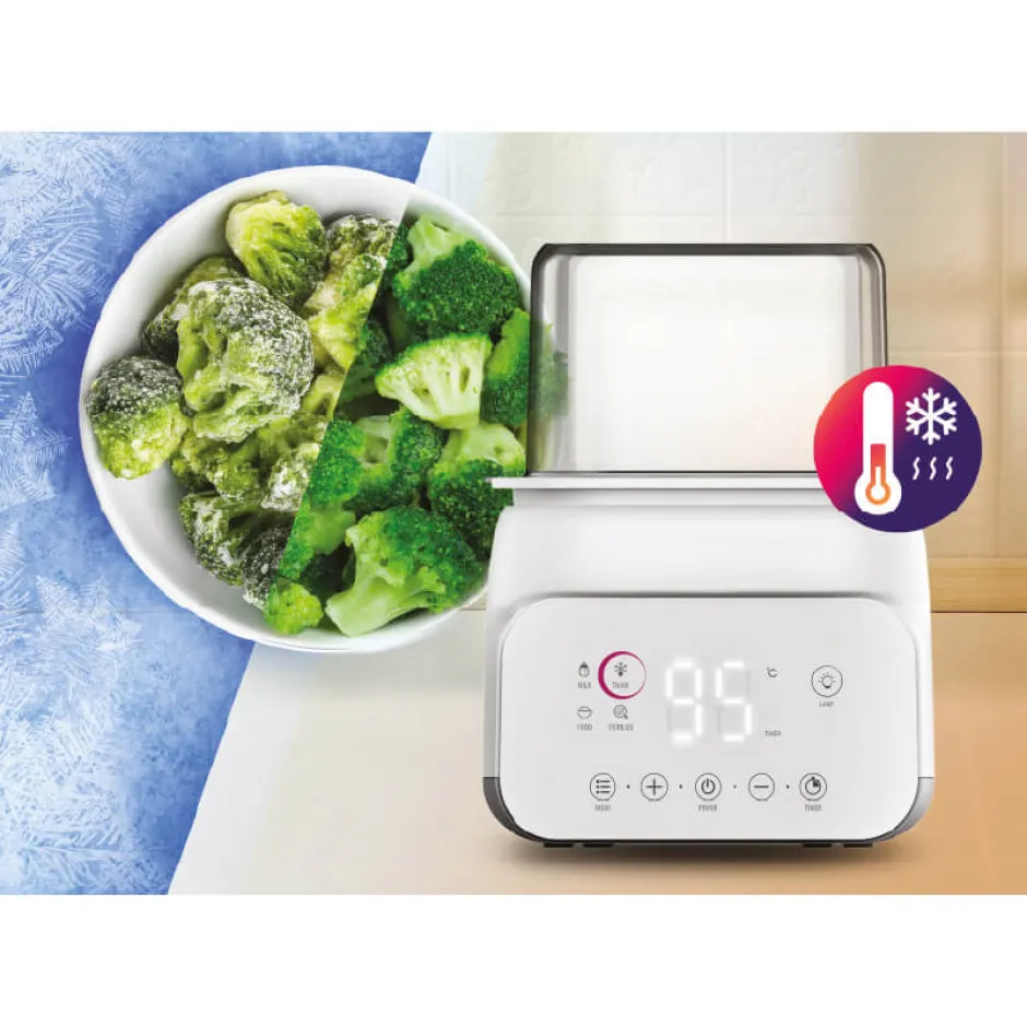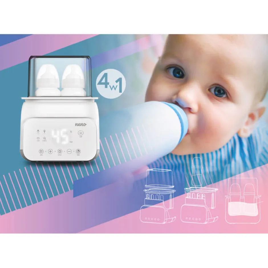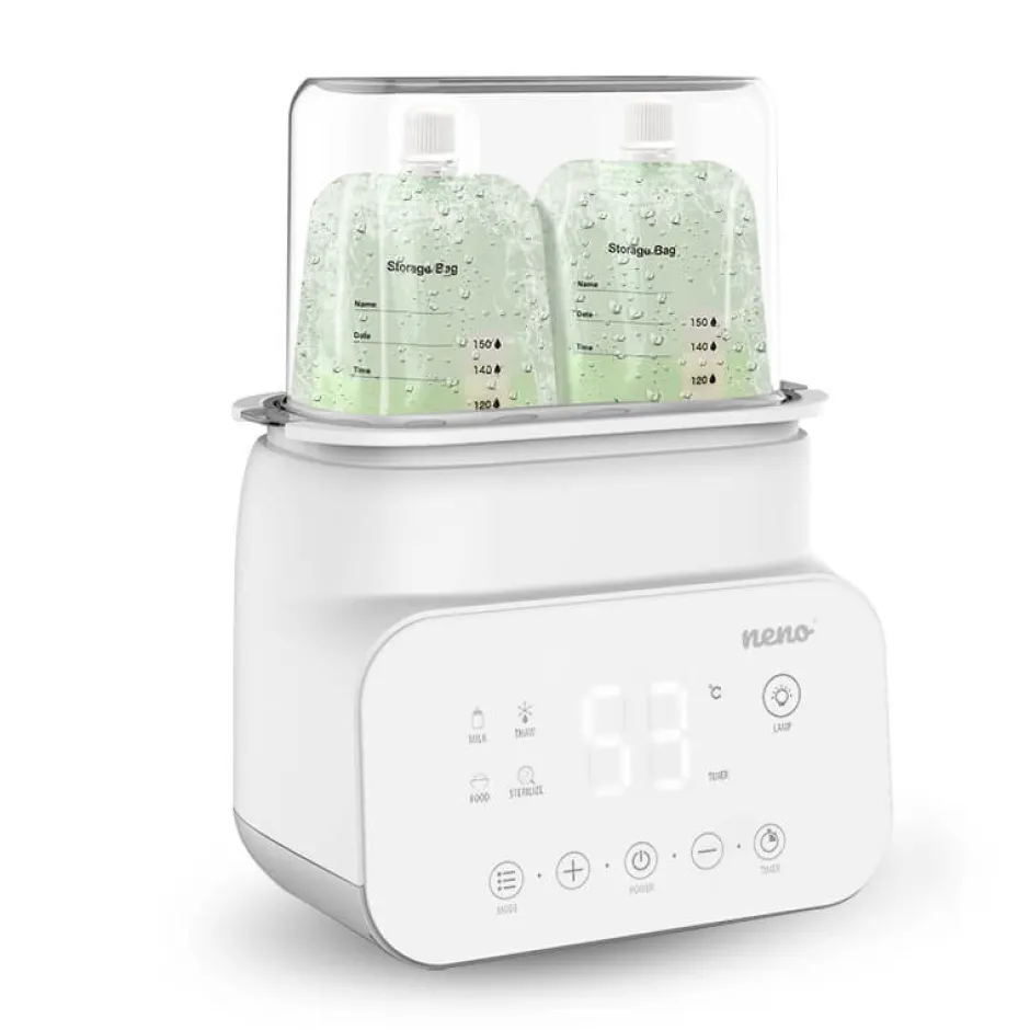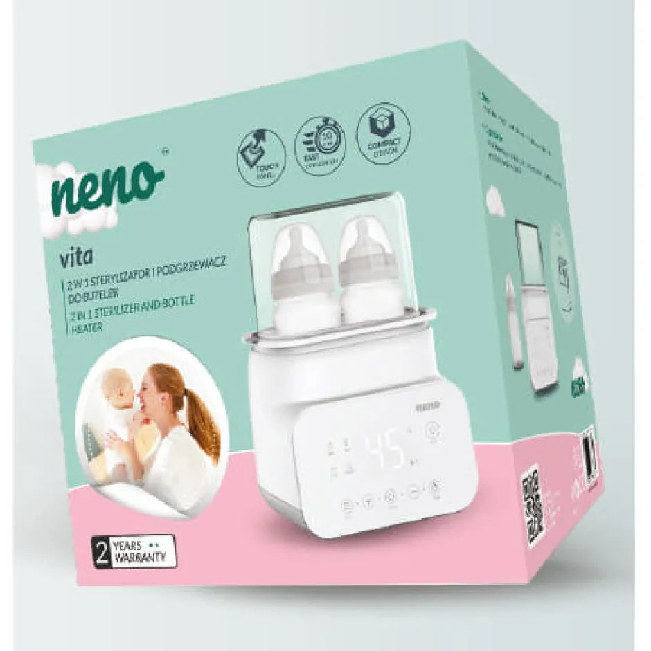 Neno Vita Sterilisator & Flaskevarmer har 4 Måder At Arbejde På – Den Steriliserer Sutteflasker, Optøer & Opvarmer Mælk & Mad! Neno Vita er udstyret med en steriliseringsfunktion, der giver dig mulighed for at holde flasker og sutter hygiejniske og sterile. Brug den medfølgende flaskesil til at fjerne genstande sikkert og bekvemt efter sterilisering for at undgå forbrændinger. Enheden har en mælkeopvarmningsfunktion, som giver dig mulighed for hurtigt og let at opvarme mælk til din baby. Alt du skal gøre er at vælge den korrekte temperatur i indstillingerne og begynde at opvarme mælken. Vita har også en optøningsfunktion, der giver dig mulighed for hurtigt at optø måltider til dit barn og opvarme dem til den temperatur, du vælger, så de er klar til at servere. Takket være den indbyggede optøningsfunktion kan du ikke kun optø færdiglavet mad og supper, men også hårde ingredienser som frugt, grøntsager og mere. Det eneste du skal gøre er at lægge de frosne fødevarer i beholderen og vælge afrimningsindstillinger på displayet. Neno Vita har en indbygget natbelysning, der giver dig mulighed for at bruge den når som helst. Lampen er installeret inde i sterilisatoren og lyser forsigtigt op på enhedens låg. Neno White Sterilisator er udstyret med et displaypanel, som giver dig mulighed for let at navigere i enheden og vælge de relevante indstillinger i henhold til dine præferencer.