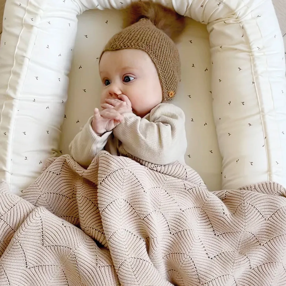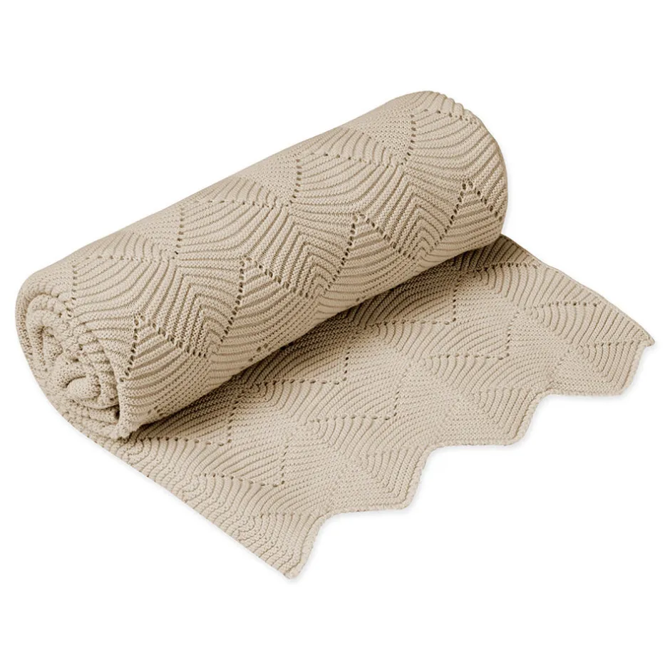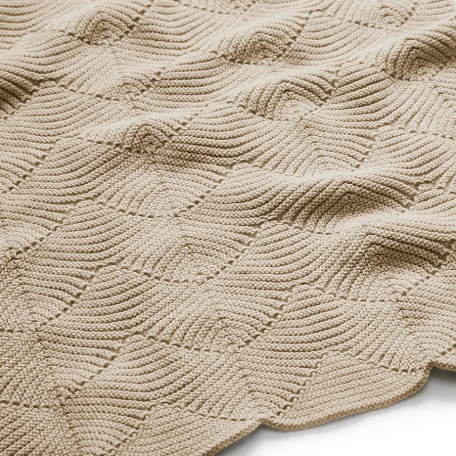 Smukt og utroligt blødt striktæppe i et fint muslingeskal mønster. Tæppet er lavet af 100% økologisk bomuld og egner sig perfekt til skønne barnevognsture såvel som til indendørs brug. Muslingestriktæppet er GOTS-certificeret.