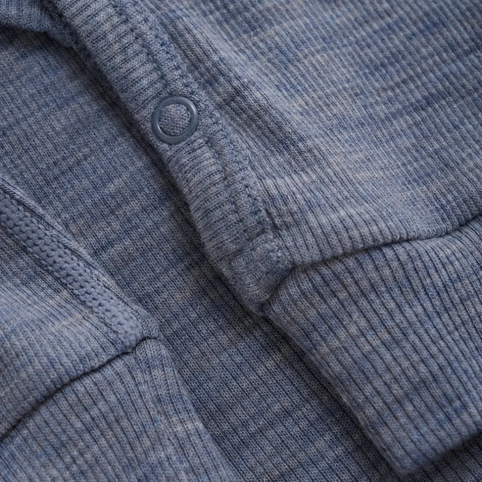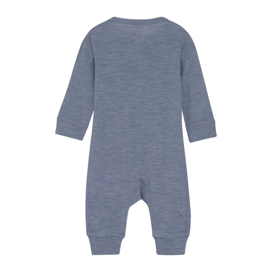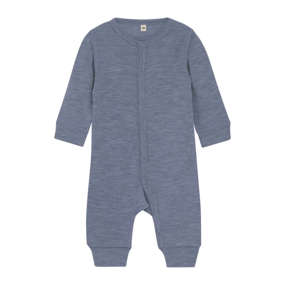 Dragten har trykknapper foran og ned langs benene, så den er nem at få af og på. Ulden hjælper naturligt med at regulere temperaturen og lede fugt væk, så dit barn holdes lunt og tørt hele dagen.