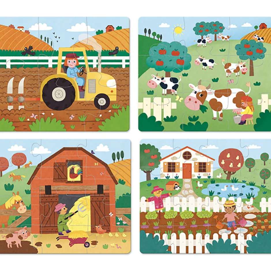 4 puslespil i træ med skønne motiver fra en bondegård. hhv. 6, 9, 12 og 16 brikker. Leveres i fin trææske med skydelåg.