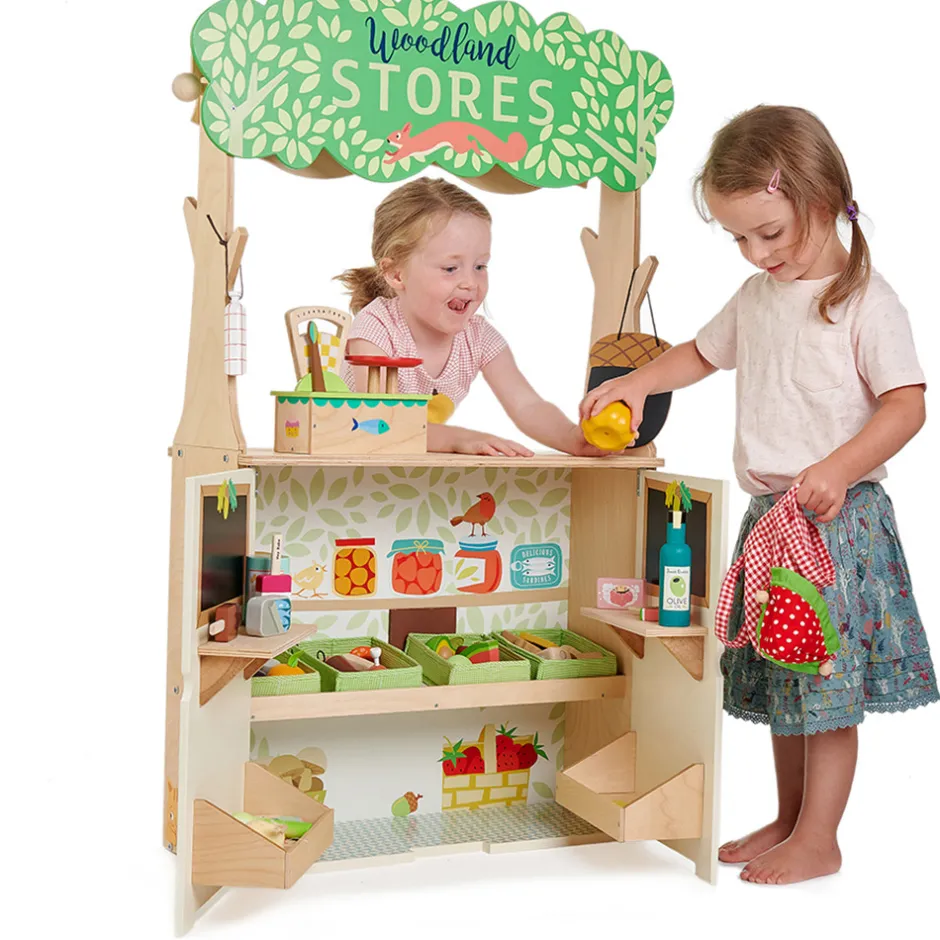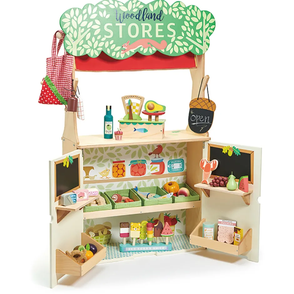 På den ene side er en Woodland Stores -legebutik med 2 døre, der åbner op til hylderne med varer og 2 tavler, hvorpå man kan skrive dagens tilbud med tavlekridt (medfølger ikke).