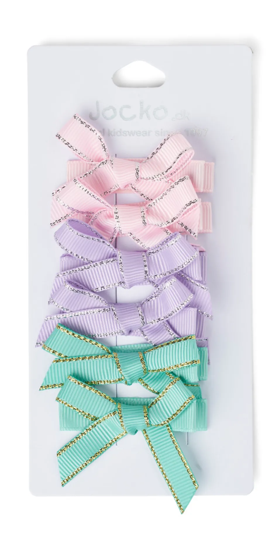 3 x 2 små hårspænder i lyserød, lilla og grøn med sølvkant