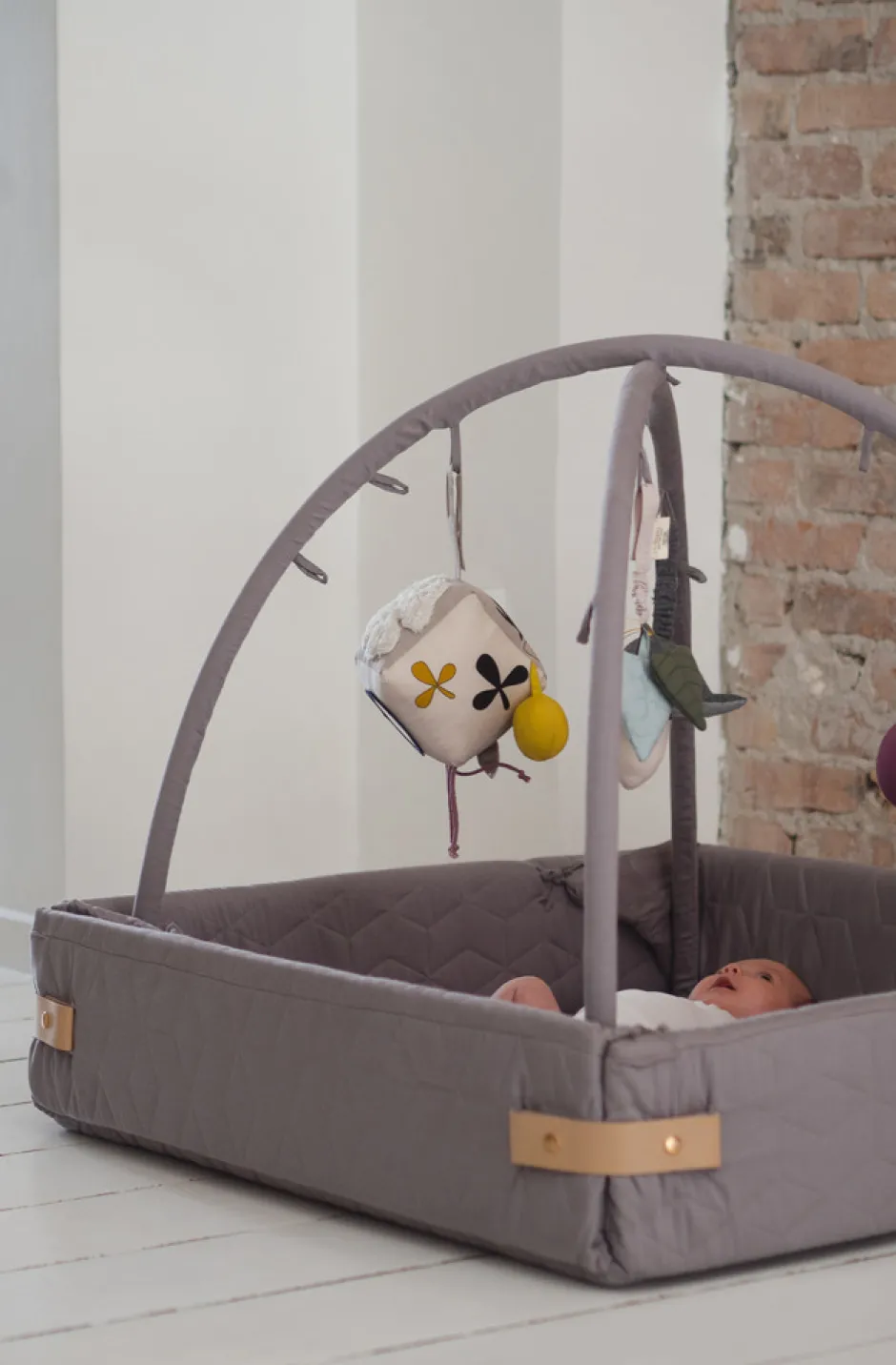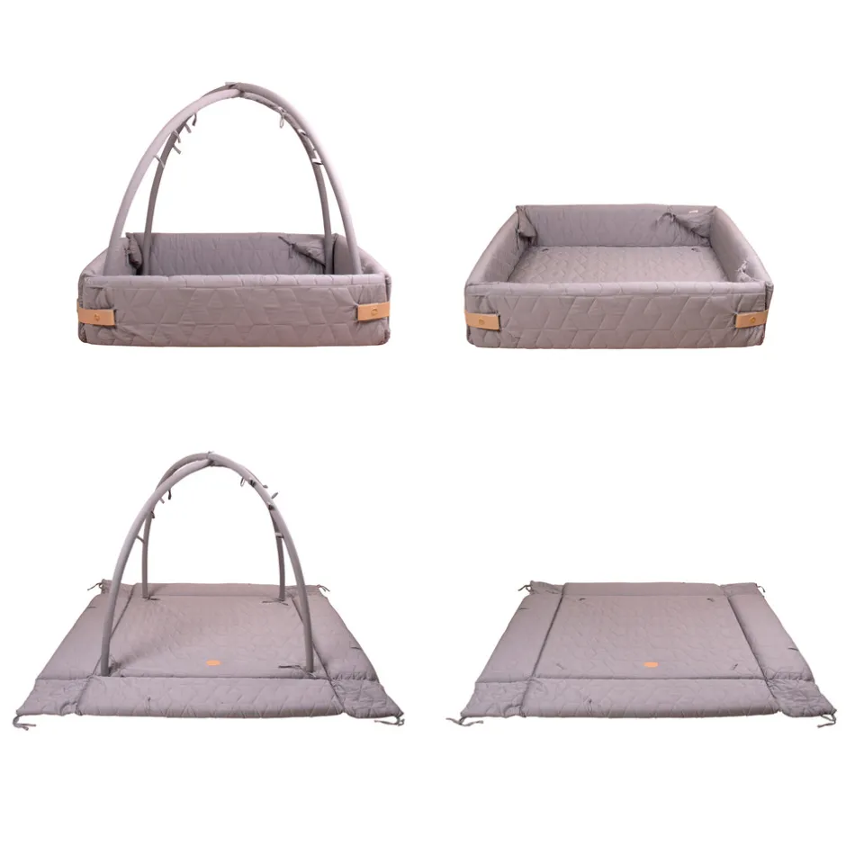 Aktivitetsnesten er udviklet til at vokse med barnet, da den har flere funktioner. Brug den som kravlegård, aktivitetstæppe, legetæppe, babynest. Når baby er helt lille kan aktivitetsnesten med fordel bruges med siderne lukket og med aktivitetsstænger på, til at hænge legetøj i eller stængerne kan tages helt af og man har en større baby nest – evt. til tvillinger. Samtidig kan siderne foldes ned, hvis man vil sidde på tæppet sammen med den lille eller når den lille begynder at kravle rundt. Når barnet bliver større kan man bruge den som legetæppe med siderne foldet ned og uden stænger monteret. Aktivitetsnesten lukkes med læderspænder der klikkes fast med en trykknap.