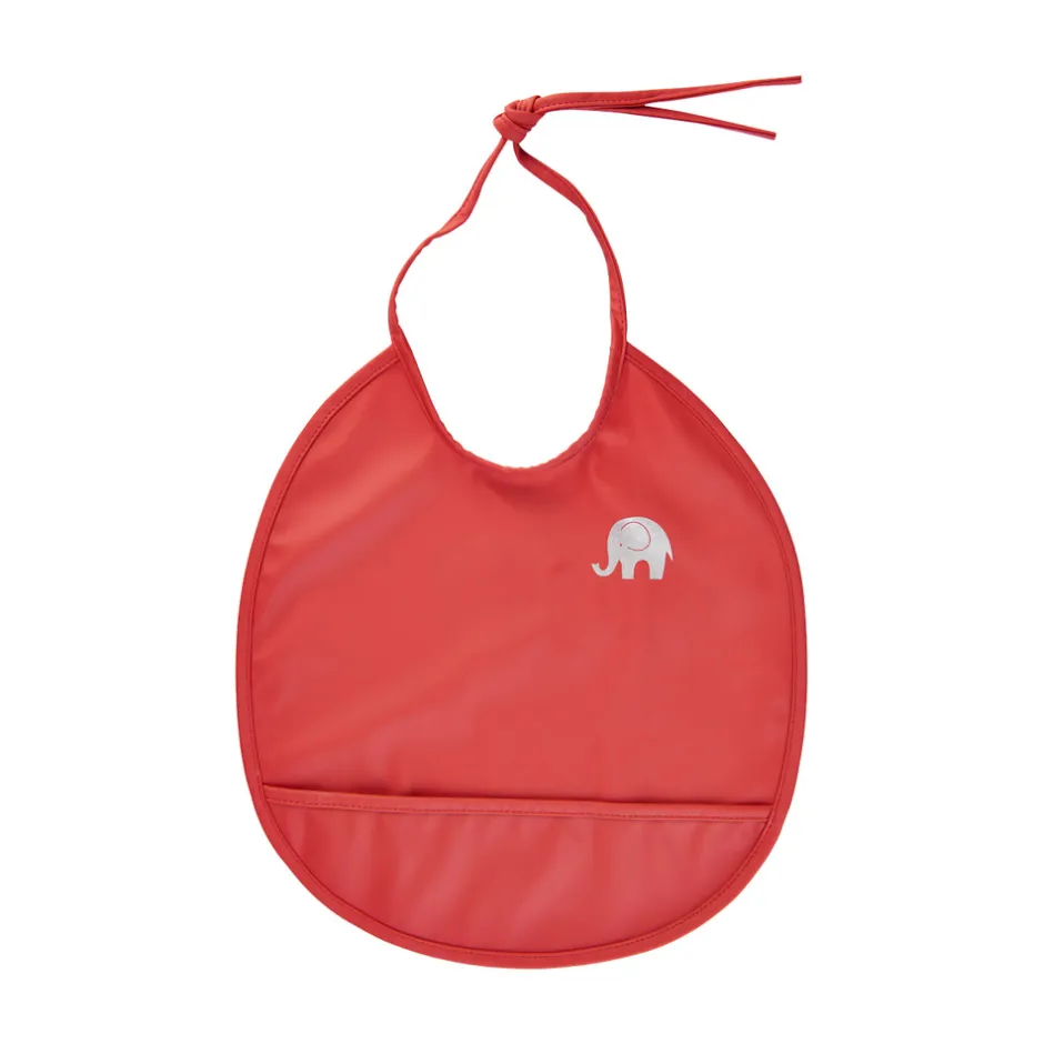 Rund, bred og praktisk hagesmæk fra CeLaVi. Åbnes og lukkes med bindebånd i nakken. Gummibelagt forside gør det nemt at tørre den af efter spisning. Materiale: 38% polyurethane – 62% polyester. Hagesmækken er uden flourstoffer.