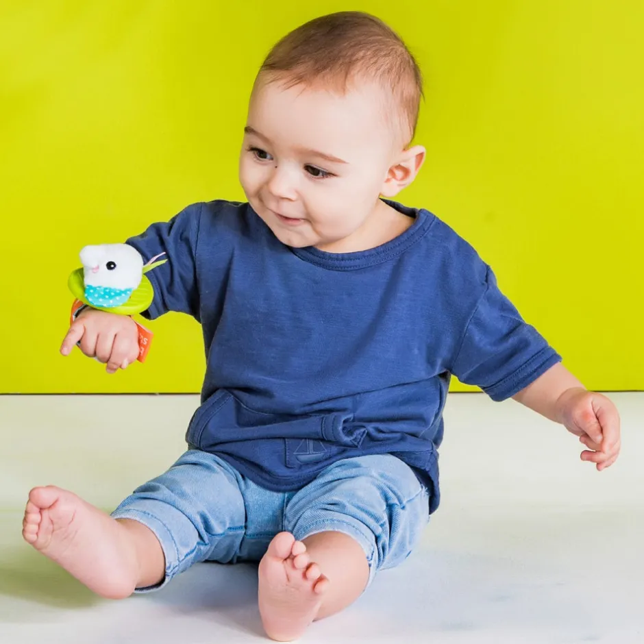 Sødeste bide-rangle-armbånd som fungerer som babys første ‘ur’. Med dette armbånd har baby altid en beskæftigelse lige ved hånden. Bideringsdelen er lavet af BPA-fri silikone til lindring af ømme gummer.