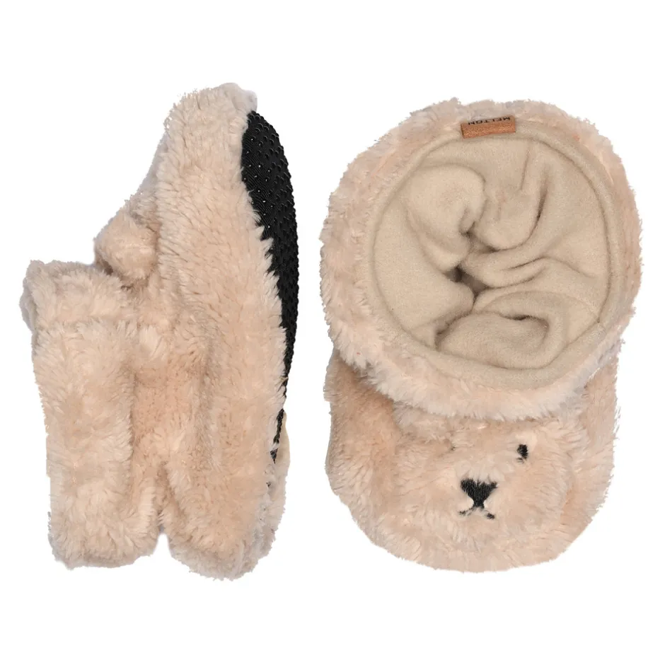 Bløde tekstilslippers fra MELTON. Den øverste del har struktur og er lavet af en blanding af polyester og bomuld, mens slippersene har et for i blød fleece. Slippersene giver barnet fuld bevægelsesfrihed og kan spændes med en justerbar rem over vristen for at sikre en bedre pasform til barnet.