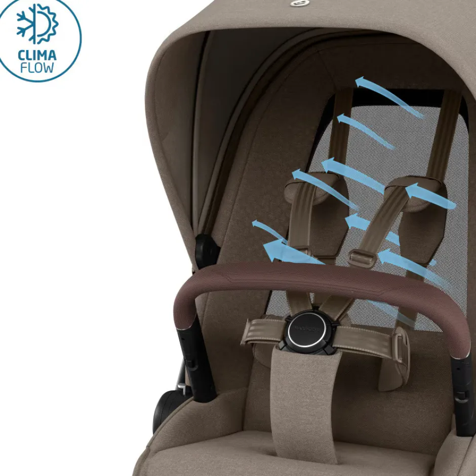 Fames ergonomiske sæde har blød polstring og ClimaFlow-mesh for optimal temperaturregulering, så dit barn har det behageligt hele året. Den store udtrækkelige UPF 50+ kaleche giver maksimal solbeskyttelse til dit barn og et gennemsigtigt ventilationsvindue.