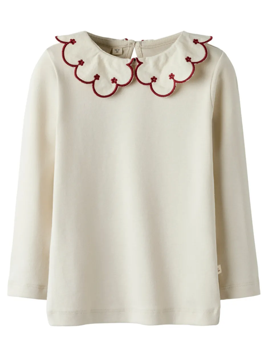 Fundo Bluse fra Lil’ Atelier i farven Turtledove er en smuk og stilfuld bluse, der kombinerer klassisk design med moderne detaljer. Den fine, bølgede krave er pyntet med broderede blomster og rød kant, som giver blusen et unikt og charmerende udtryk. Blusen er lavet i en blød og behagelig kvalitet, der sikrer komfort hele dagen, og den praktiske lukning i nakken gør den nem at tage af og på. Perfekt til både hverdag og festlige lejligheder, hvor dit barn skal være ekstra fint klædt på. Den neutrale farve gør den nem at kombinere med andre styles i garderoben.