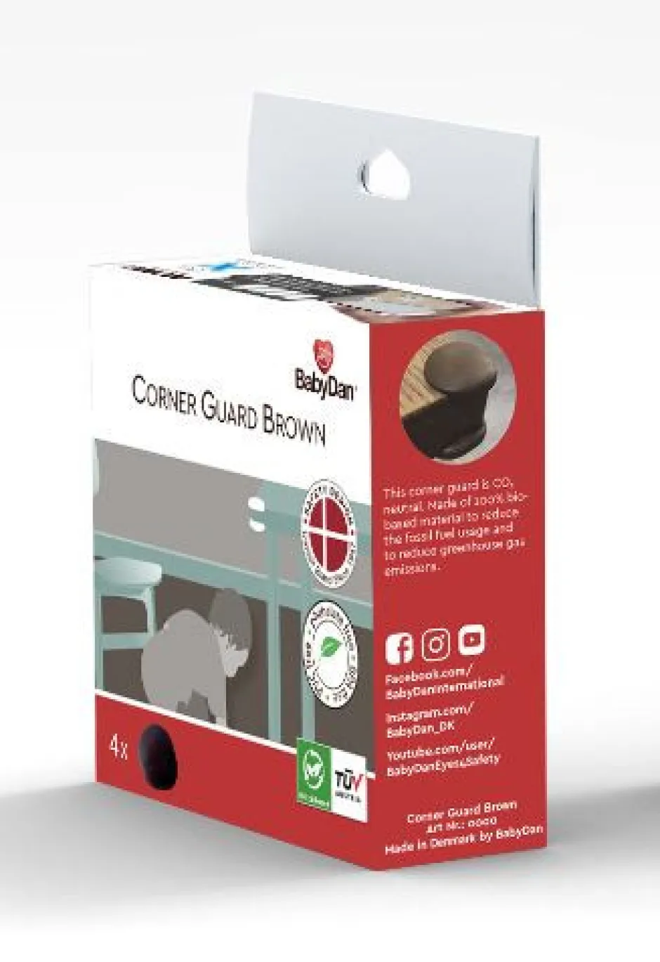 Hjørnebeskytter.Beskytter dit barn mod skarpe kanter på borde og skabe.Fås i brun oghvid. Lavet af 100% biobaseret materiale for at reducere brugen af fossilt brændstof ogfor at reducere drivhusgasemissioner. Materialet er fødevaregodkendt. Der bruges ingen skadelige kemikalier. Testet fri for giftige stoffer som ftalater, BPA og PVC. Emballagen er 100% biologisk nedbrydelig, Cradle-to-Cradle cerfificeret.