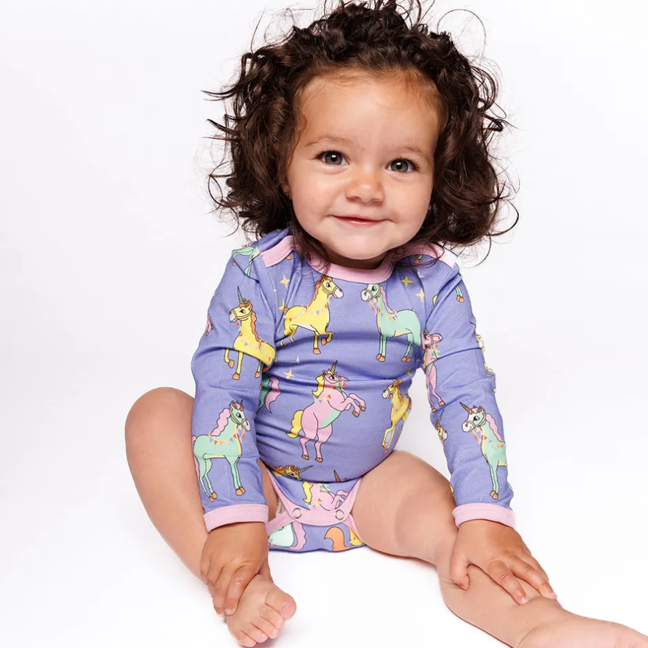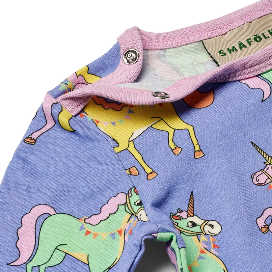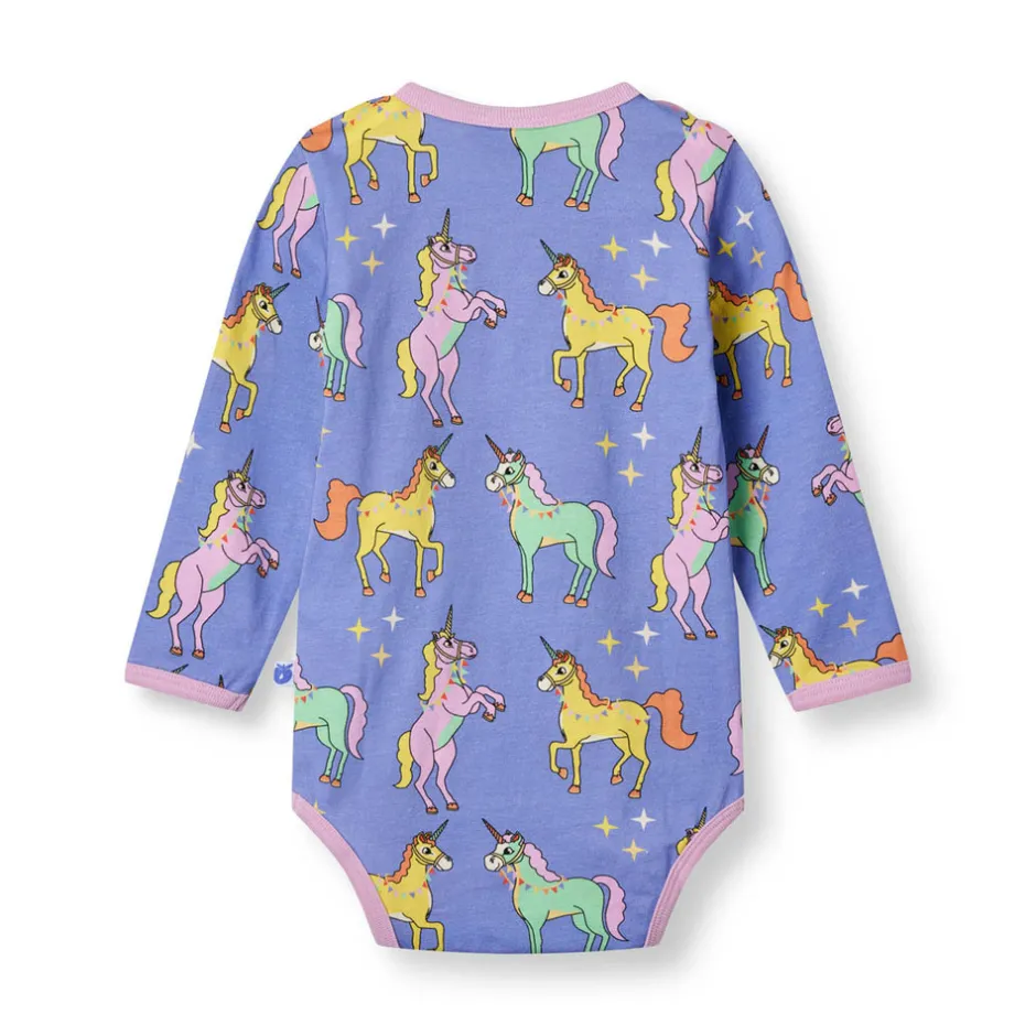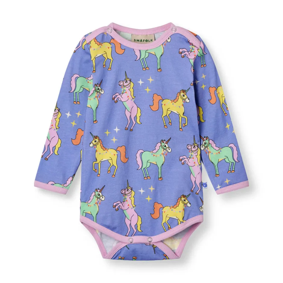 Langærmet baby body med enhjørninger produceret i en økologisk og strækbar bomuldsjersey. Denne body har en normal pasform med kuvertlukning og trykknapper, samt ribkant i hals og ærmer.