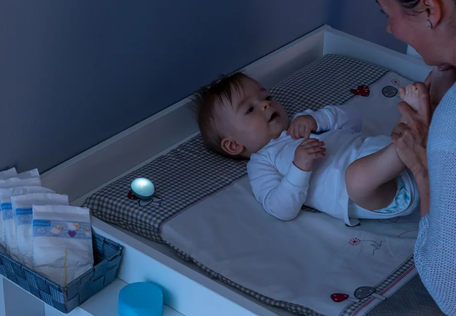 Denne lampe er lille, praktisk og lige til at clipse på tøjet. Den kan bruges ved amning eller ved puslebordet. Lampen udsender et blødt lys, men lys nok til at man kan bruge den om natten uden unødigt at forstyrre barnets søvn. Lampen har to forskellige lysstyrker og en timer på 15 min. USB genopladeligt batteri.