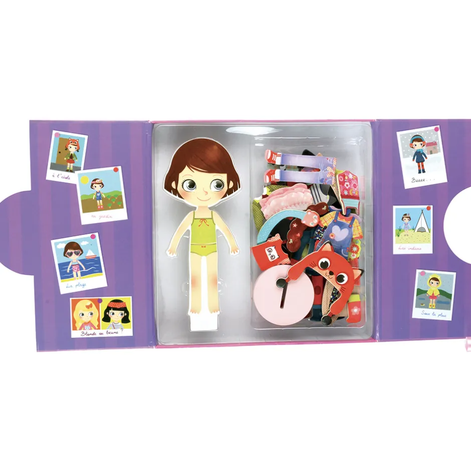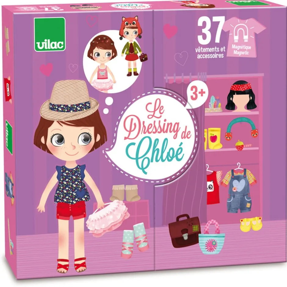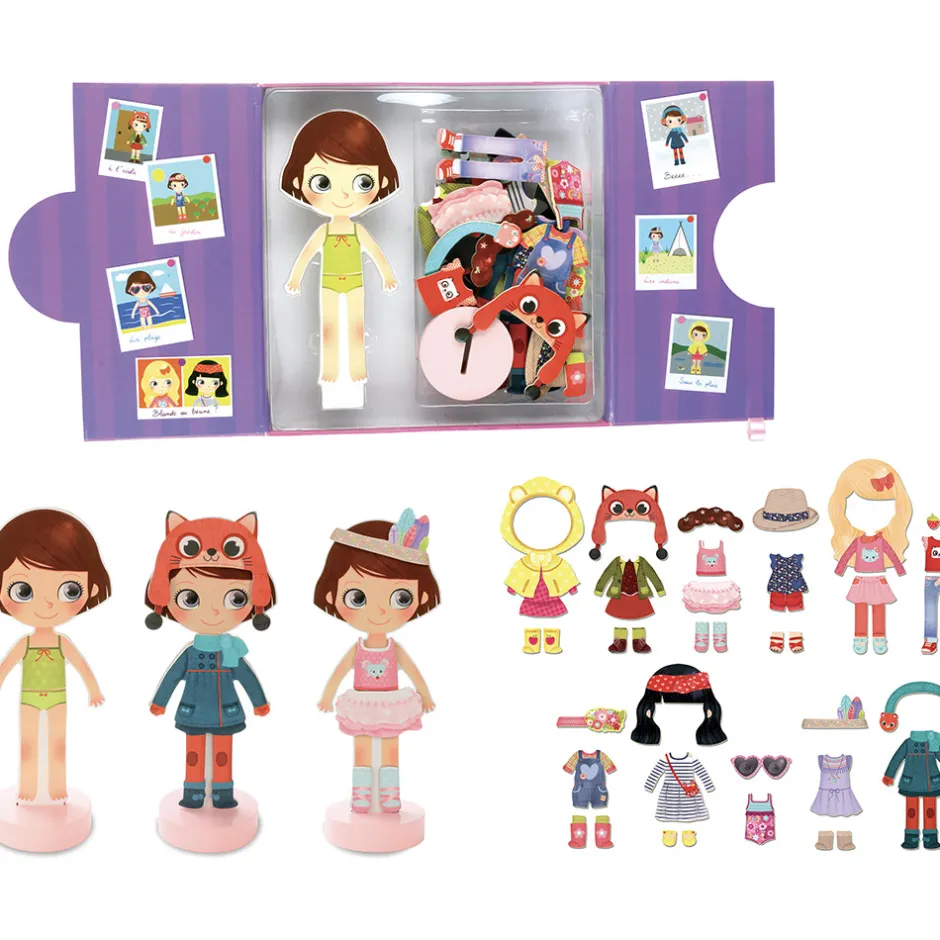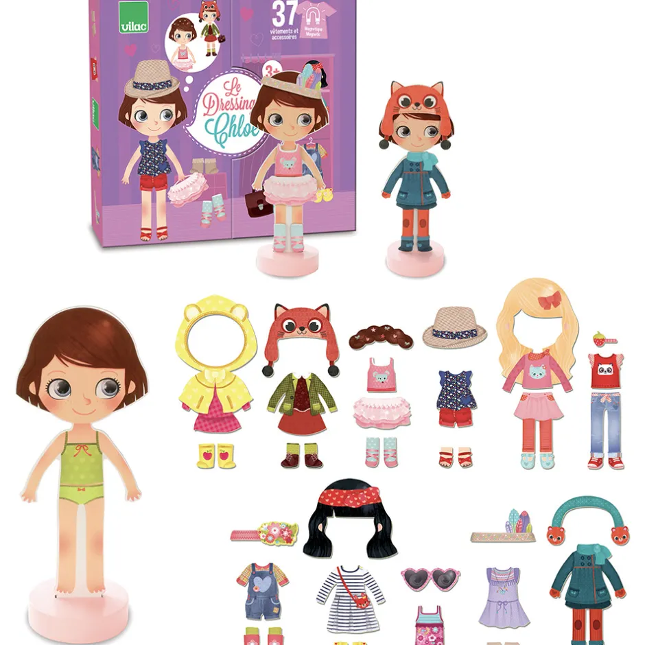 Den klassiske påklædningsdukke i et moderne udtryk. Lavet i træ med fod, så hun selv kan stå op, og magnetisk, så tøjet bliver siddende. Hun har flere smukke outfits både til sommer og til vinter, til skole og fritid. Sættet indeholder ialt 42 magnetiske dele: nederdele, kjoler, hatte og bukser. Chloe kan endda skifte frisurer.
