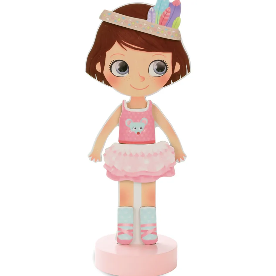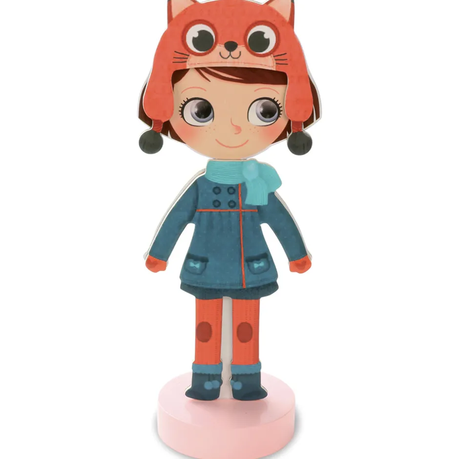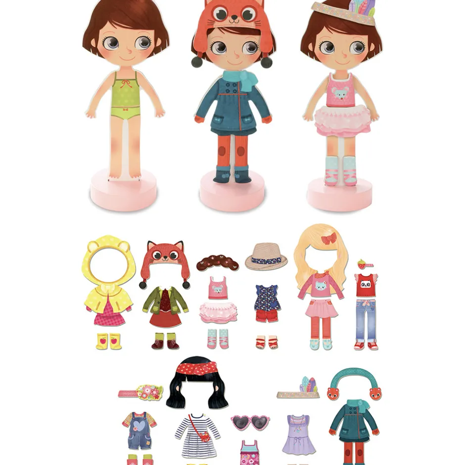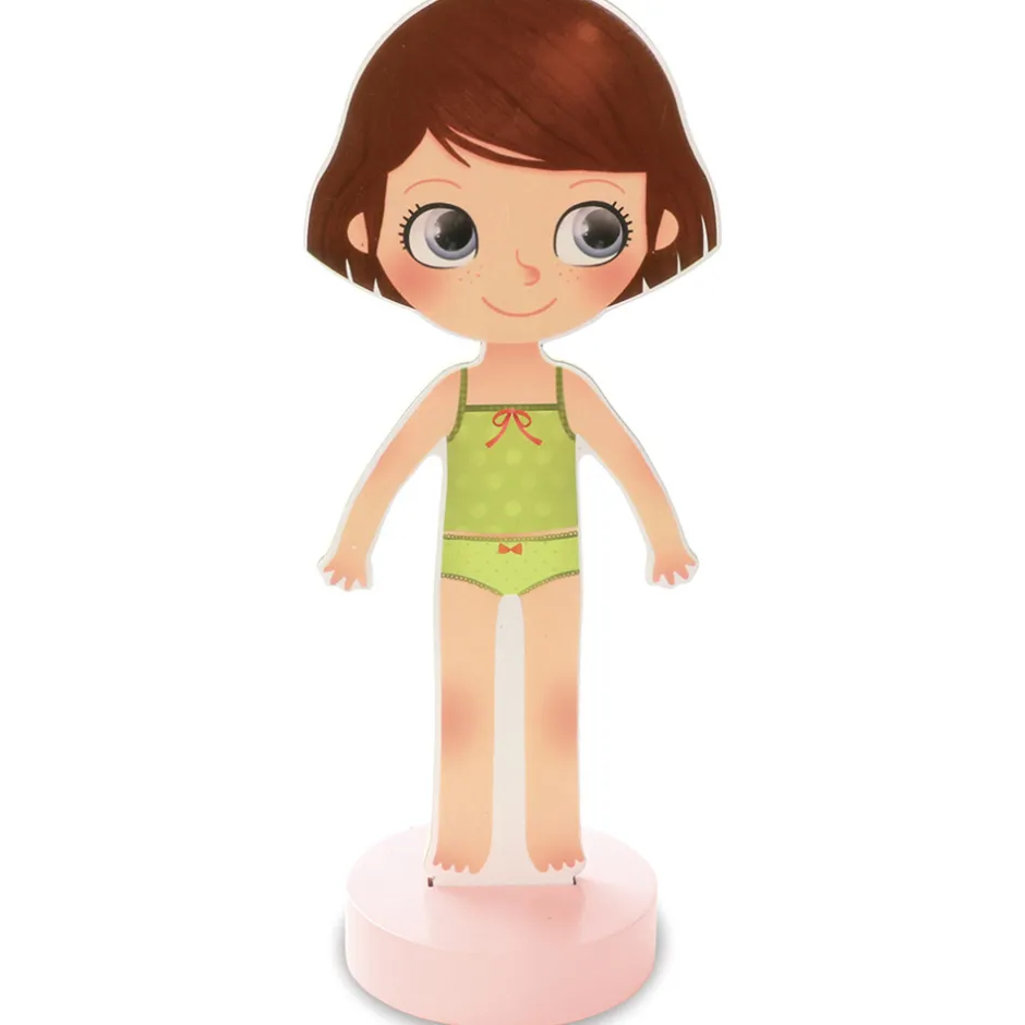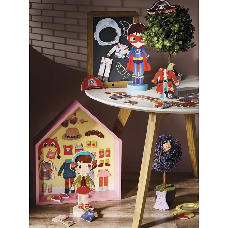Den klassiske påklædningsdukke i et moderne udtryk. Lavet i træ med fod, så hun selv kan stå op, og magnetisk, så tøjet bliver siddende. Hun har flere smukke outfits både til sommer og til vinter, til skole og fritid. Sættet indeholder ialt 42 magnetiske dele: nederdele, kjoler, hatte og bukser. Chloe kan endda skifte frisurer.