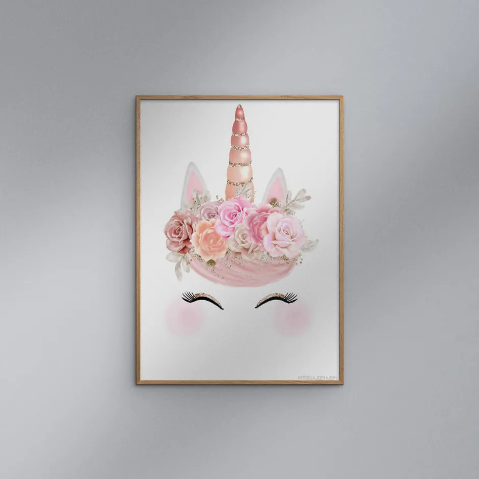 Giv børneværelset et magisk løft med denne smukke plakat med enhjørning fra Poster & Frame. Plakaten er designet i blide rosa og lyserøde nuancer, der sammen med de fine blomster og det glitrende horn skaber et eventyrligt udtryk. Motivet indbyder til leg og fantasi og passer perfekt ind i ethvert pigeværelse eller som en sød gaveidé til barnedåb, fødselsdag eller bare fordi. Plakaten er trykt på kraftigt papir, hvilket sikrer en flot og holdbar kvalitet, der holder længe. Hæng den op alene eller kombiner med andre plakater for et personligt udtryk.