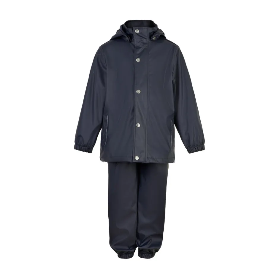 Regntøj i vind- og vandtæt funktionsmateriale fra EN FANT. Sættet har svejsede sømme. Jakken har aftagelig hætte med trykknapper og i øvrigt YKK lynlås i front. Elastisk, justerbar talje samt elastik ved ærmer. Bukserne har elastik forneden på benene og forstærket justerbar elastik under foden. Str. 86-104 har elastiske, justerbare seler med spænder i plast. Str. 110-140 er uden seler og har elastik omkring taljen. 3M reflekterende detaljer. Uden for. PU gummibelagt materiale uden miljøfarlige fluorcarboner. Vandfast: 5.000 mm.