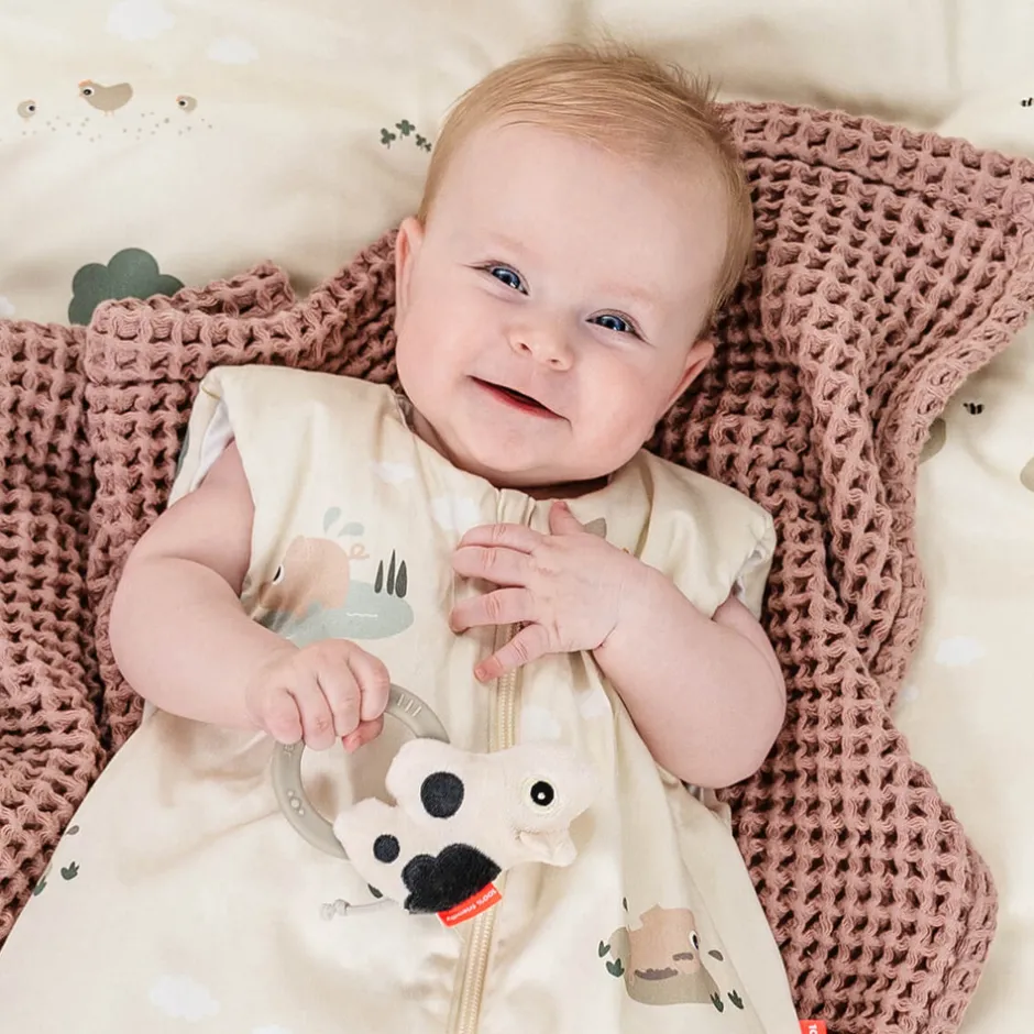 Bideringen i silikone er perfekt til at stimulere og berolige kløende tandkød, hvilket gør den ideel under tandfrembrud. Den fine, rolige farve med kontrastfarver giver visuel stimulering, der fanger dit barns opmærksomhed.