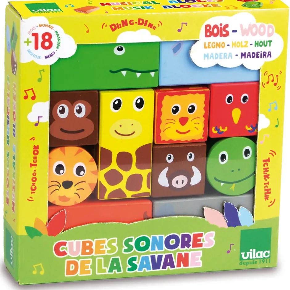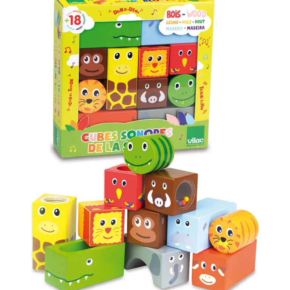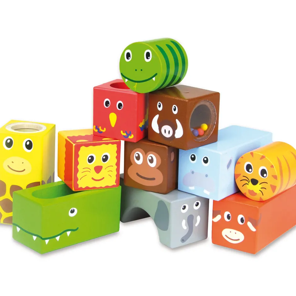 Et sensorisk legetøj med raslelyde at gå på opdagelse i. Hver af de 11 træklodser er udformet som en klassisk stableklods og malet som et dyr. Hvis du ryster nogle af dem, kan du høre en raslen som i en maracas. Nogle har skjulte perler i sig, andre kan du kigge ind til og andre har træringe på pinde. Ud over at lære dyrene og de forskellige funktioner at kende kan barnet også øve sig i at sætte klodserne på plads, så de ikke vælter. Dette charmerende legetøj udfordrer finmotorikken, hånd-øje koordination og opmuntrer fingerfærdighed.