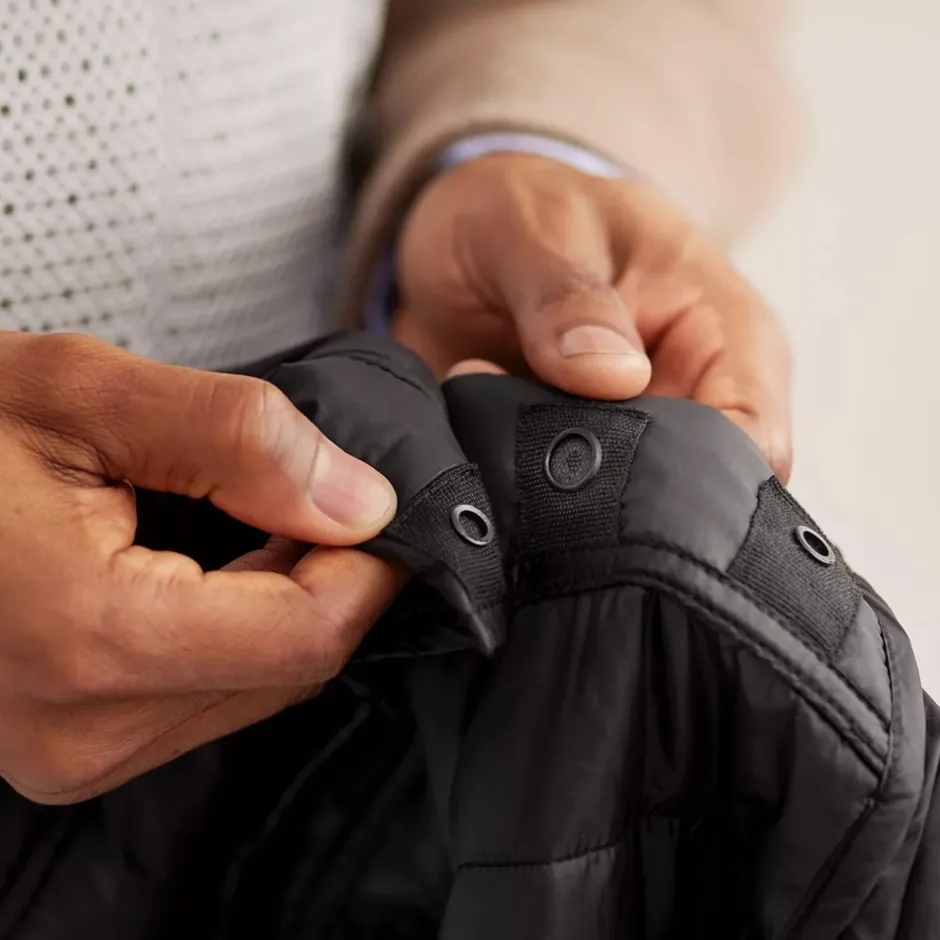 Ydermateriale og foring i 100 % genanvendt polyester (GRS-certificeret). Materialet er behandlet med en PFC-fri vandafvisende finish, der beskytter mod let regn og sne. Polstringen er lavet af Thermore, et banebrydende materiale fremstillet af 100 % polyester. Dette innovative materiale er meget varmt, selv når det er vådt, takket være dets fremragende isolerende egenskaber.