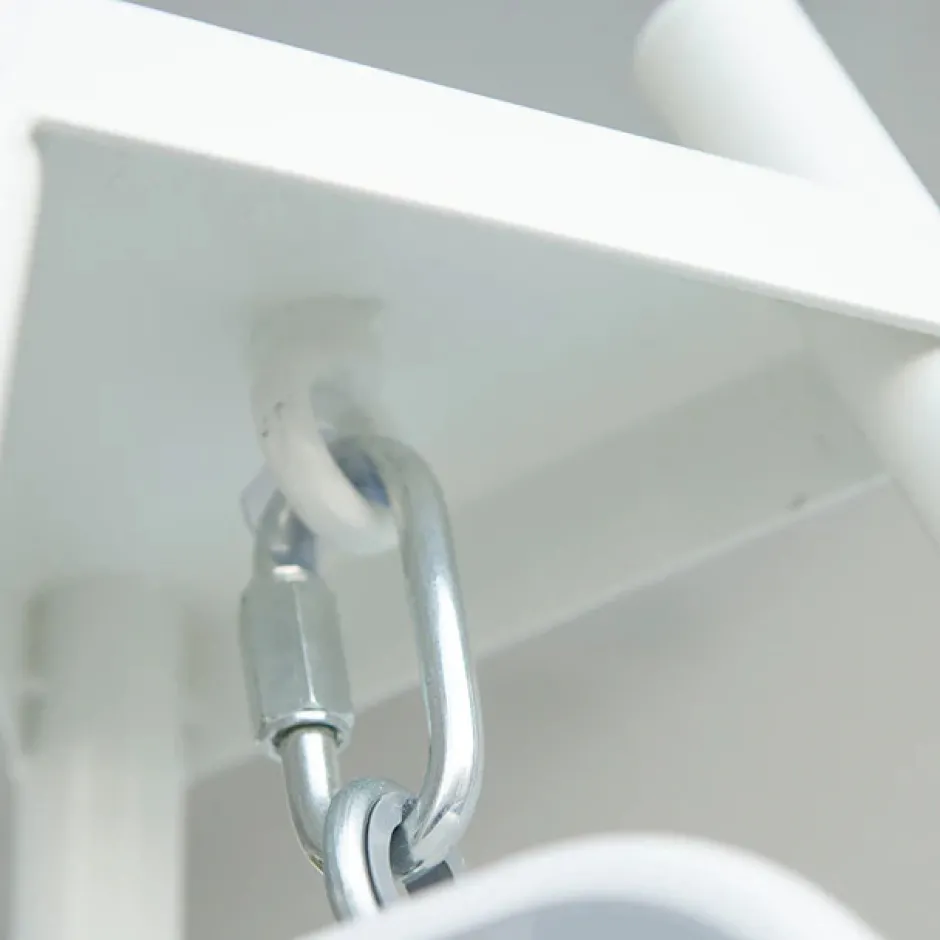 Membantu vuggestativ, er enkelt i sit design og kan passe ind i de flestes hjem. Med et vuggestativ kan du sætte din slyngevugge op alle steder. Stativet kan flyttes rundt og samles uden brug af værktøj, alt efter hvor de voksne befinder sig i hjemmet, og det er let at montere både slyngevuggen og motoren i toppen. Højde: 216 cm. Gulvareal: 125 cm.