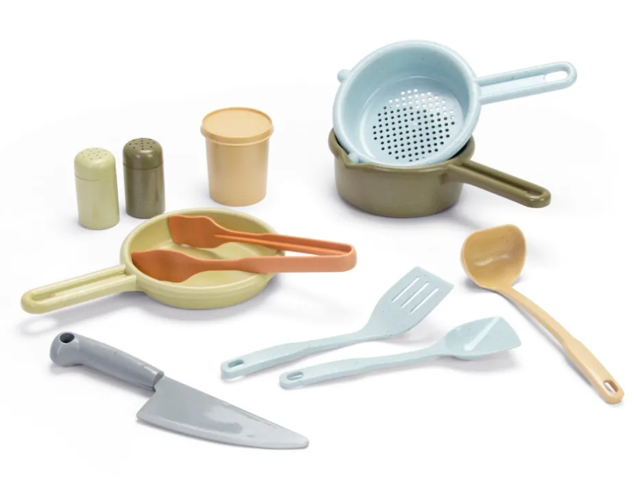 Så kan der kokkereres og serveres. Styrker bl.a. barnets sociale relationer i rolleleg med andre børn eller voksne. Solidt og slidstærkt køkkensæt, som kan holde til at bruges igen og igen, i nye trendfarver, lavet af svanemærket bioplast (sukkerrør). Kan gå i opvaskemaskinen. Styrker bl.a. barnets fysiske udvikling og fantasi