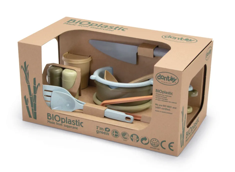 Køkkensættet er danskproduceret bioplast legetøj fra Dantoy der er fremstillet af sukkerrør, derved er produktet 100% genanvendeligt.