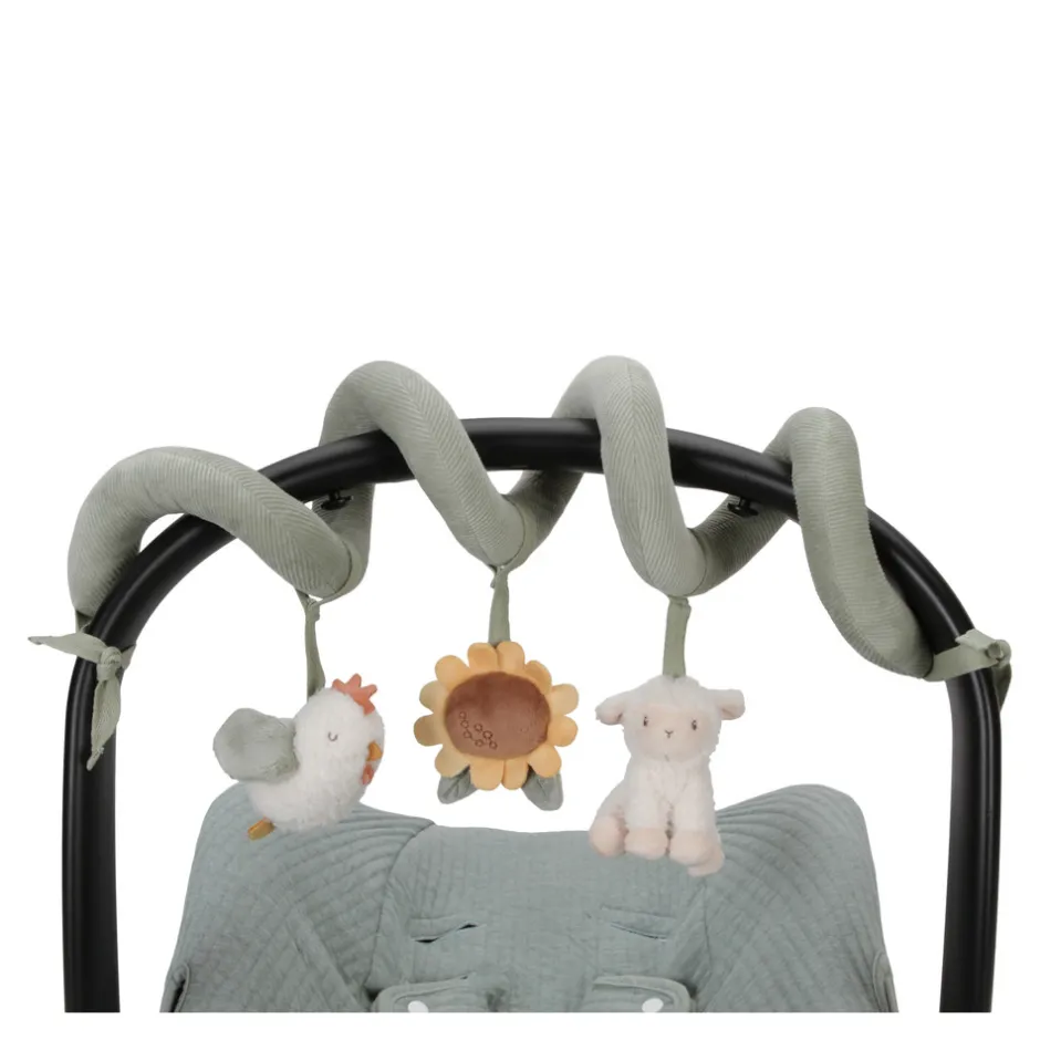 Se, føl og opdag! Den sjove og engagerende aktivitetsspiral vil underholde babyer både derhjemme og på farten. Fastgør nemt aktivitetsspiralen til alt fra tremmesenge til kravlegård, klapvogn eller autostol. Aktivitetsspiralen udfordrer sanserne og stimulerer hånd-øje-koordinationen. Aktivitetsspiralen er lavet af fløjl med bomuld og har et lille får, en glad høne og en smuk solsikke.
