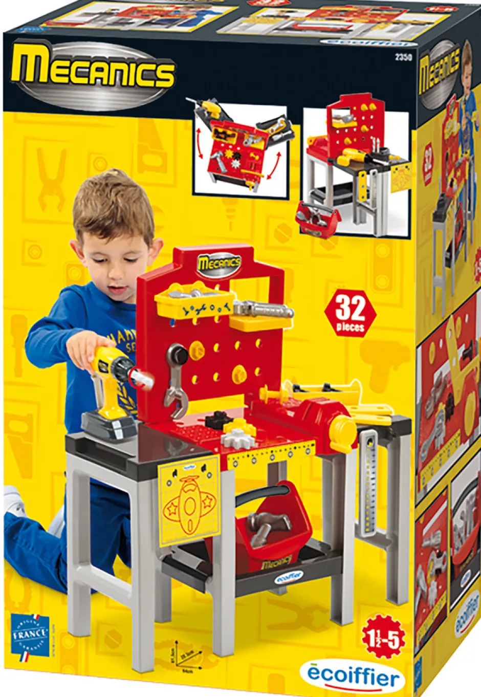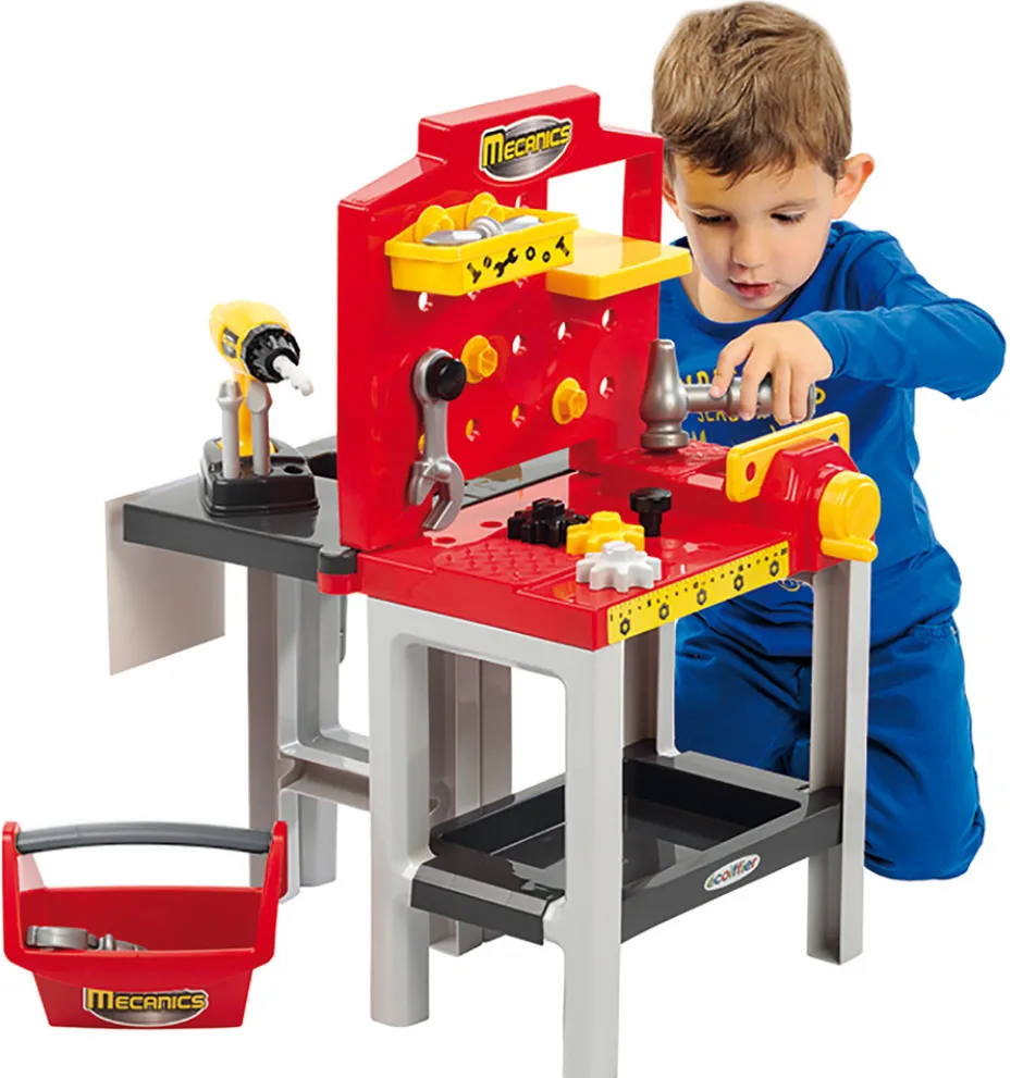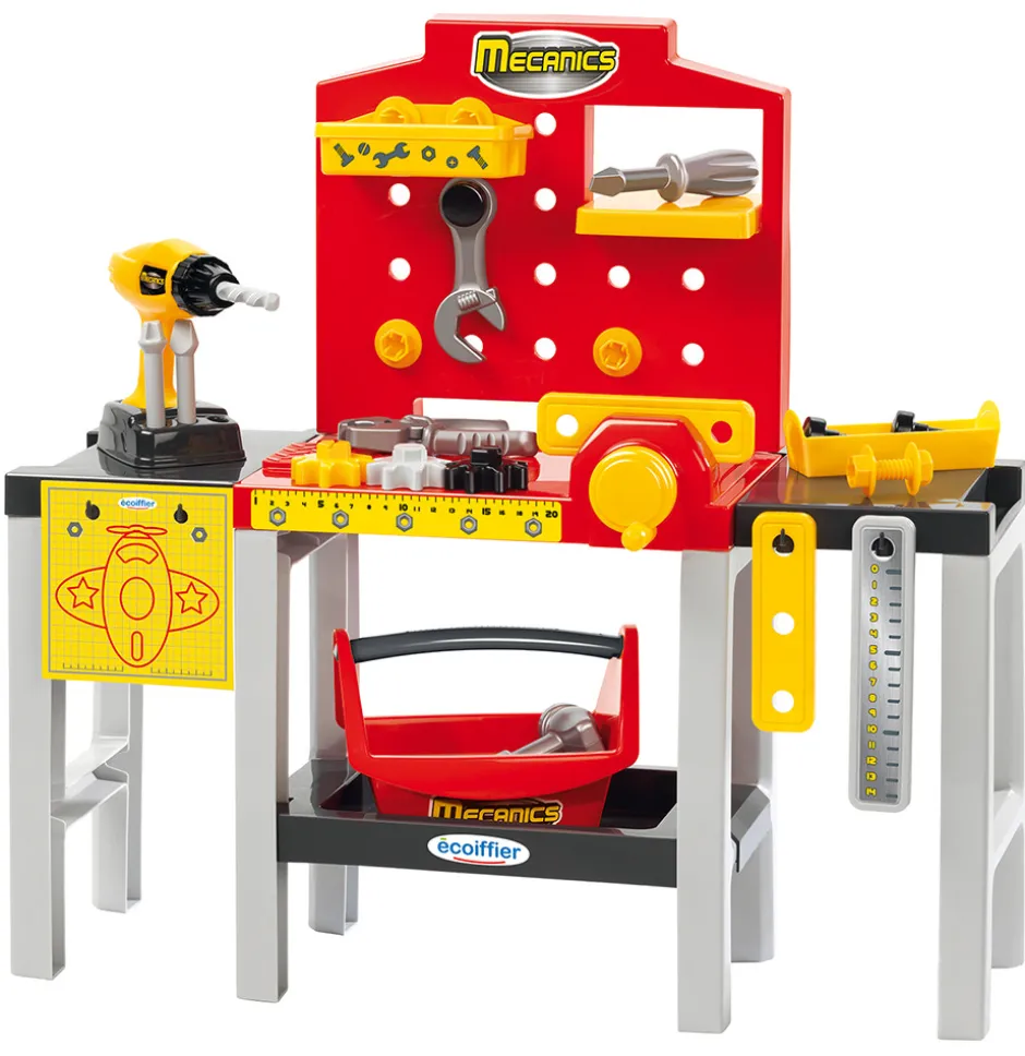 En arbejdsbænk med drejelige hylder, værktøjskasse, boremaskine med udskiftelige bor og en masse tilbehør.